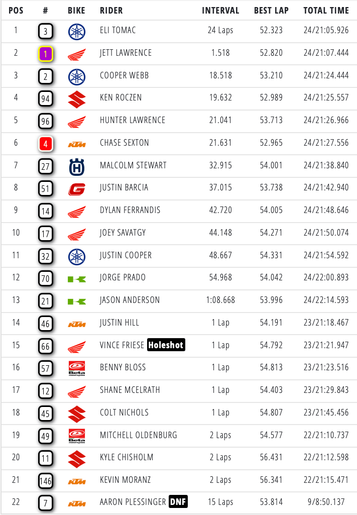In de 450 klasse won Tomac de finale na een spannende strijd met Jett Lawrence. Cooper Webb werd derde voor Ken Roczen en Hunter Lawrence.
