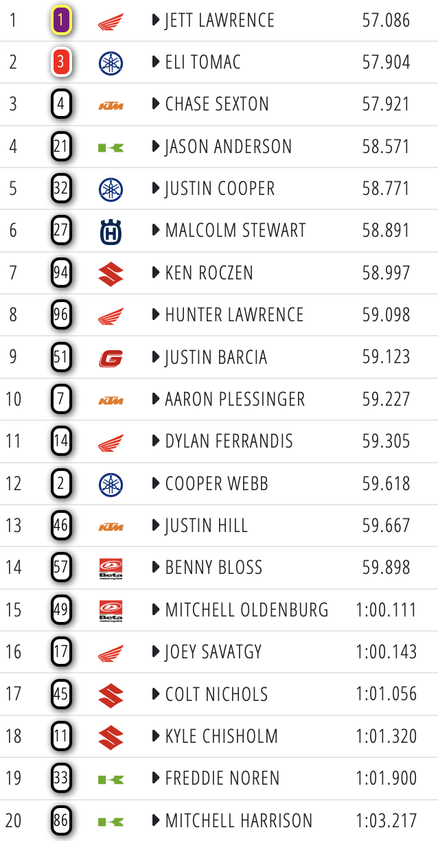Julien Beamer en Jett Lawrence pakken pole position in Anaheim 2 by motocrossplanet25 januari 2025 Julien Beaumer en Jett Lawrence hebben tijdens de derde wedstrijd van het Amerikaans Supercross Kampioenschap in Anaheim de snelste tijden neer weten te zetten. Bekijk hieronder de volledige uitslagen: 450: 250: 50