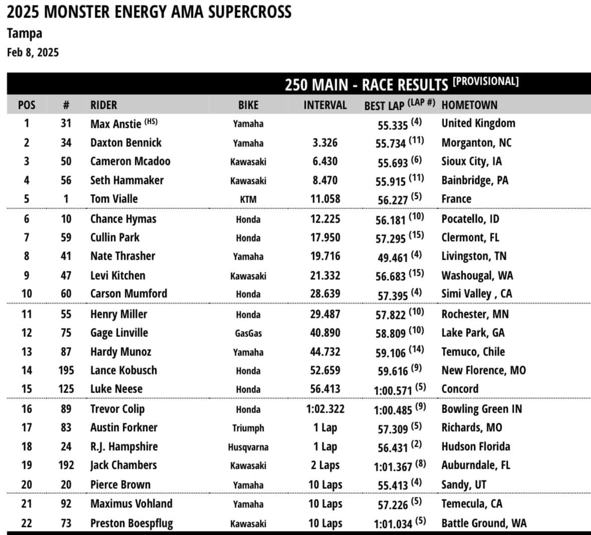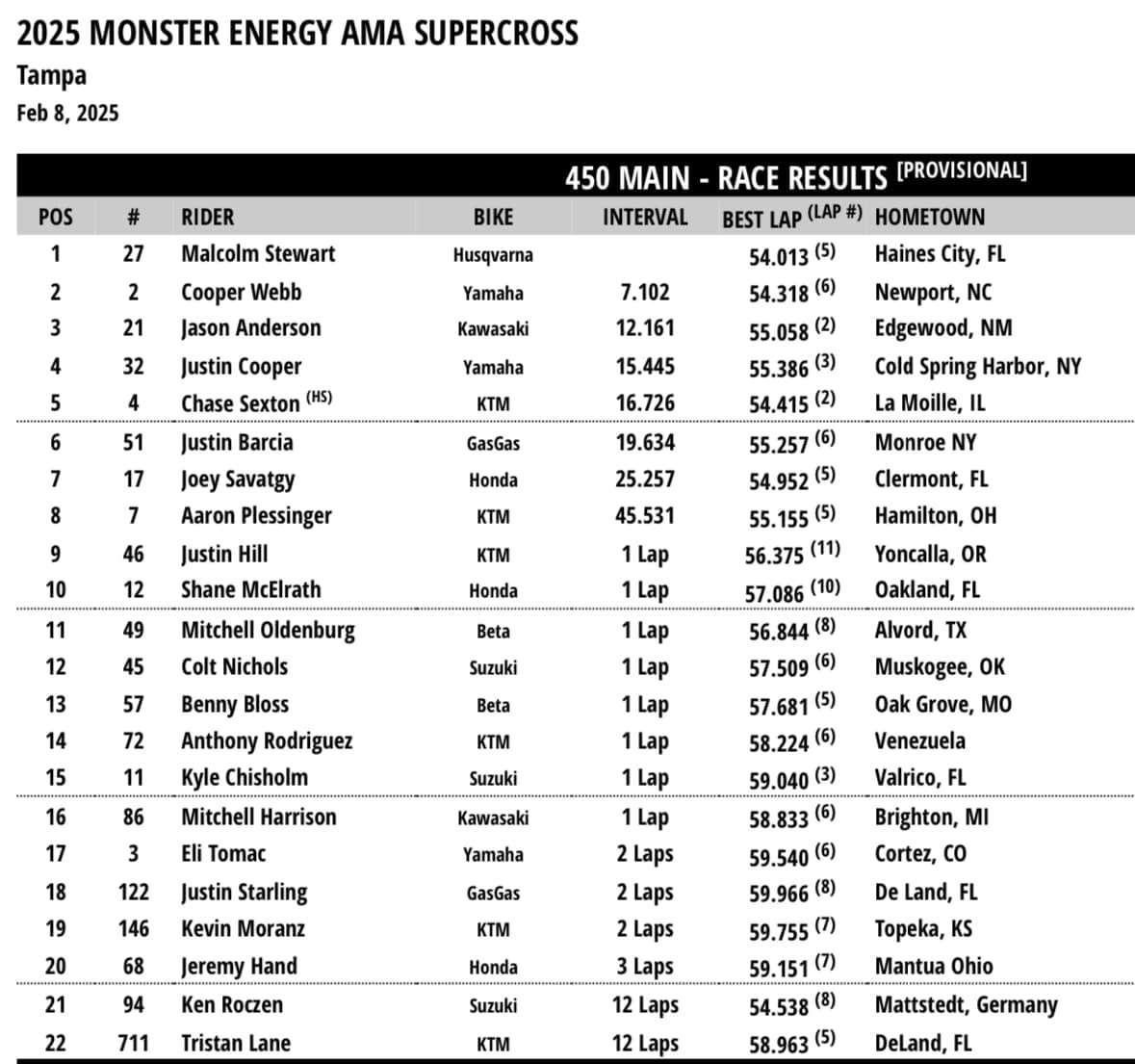 Malcolm Stewart heeft in Tampa zijn allereerste Supercross in de 450 klasse weten te pakken. Stewart won de wedstrijd voor Cooper Webb en Jason Anderson. Justin Cooper eindigde als vierde en Chase Sexton werd vijfde en blijft hiermee leider in de tussenstand.
