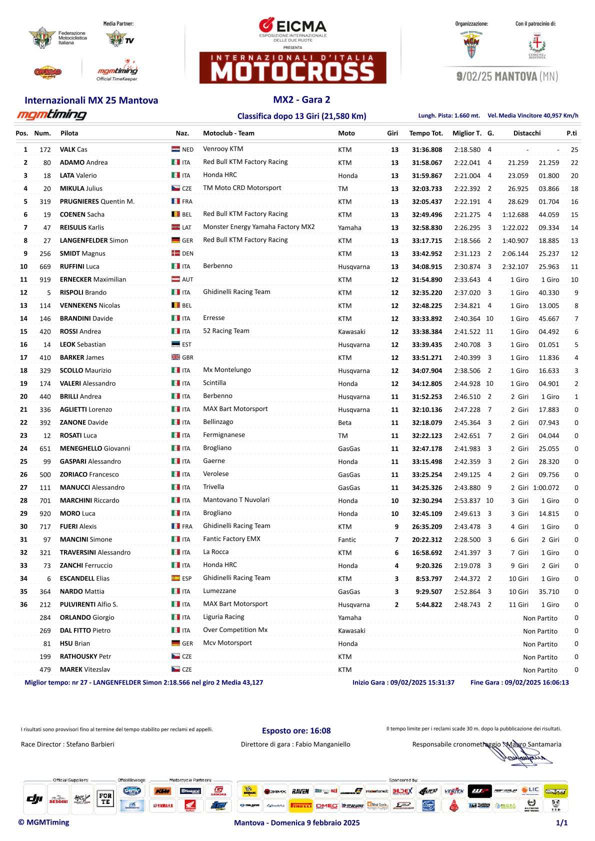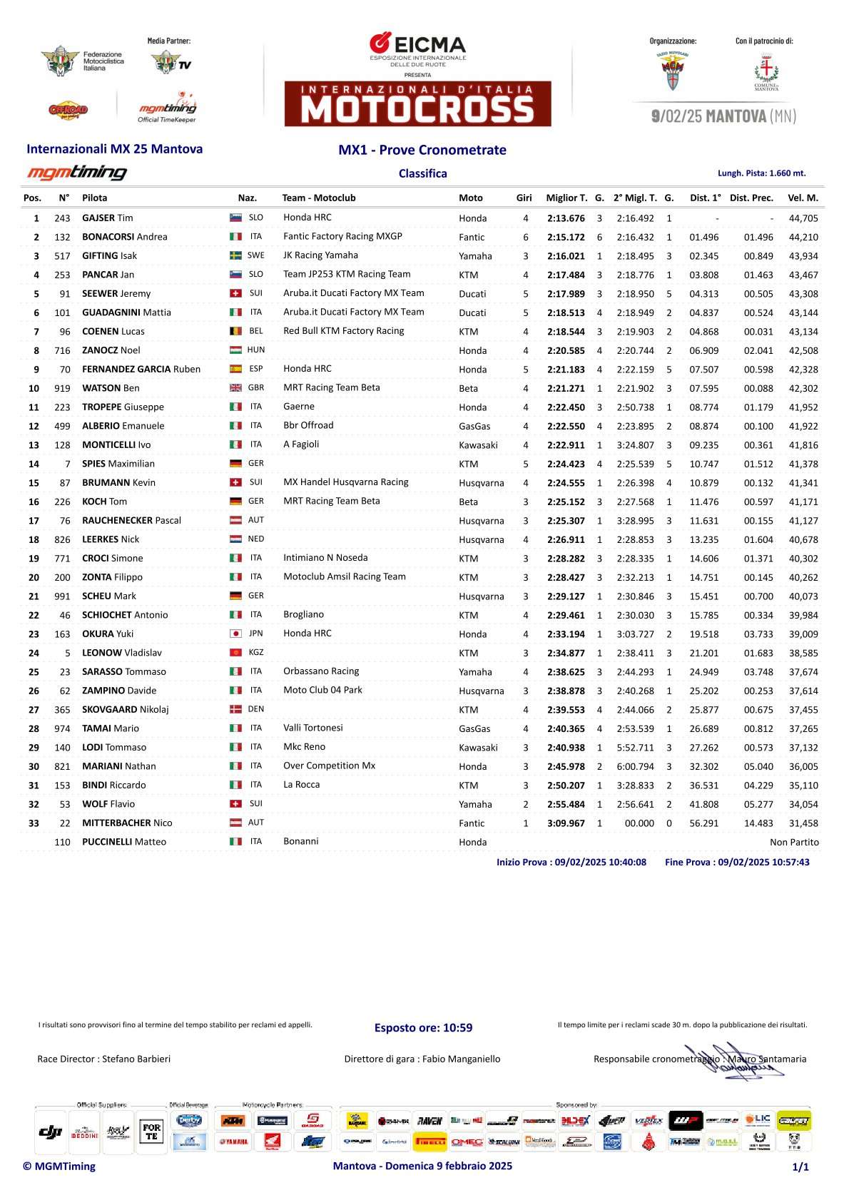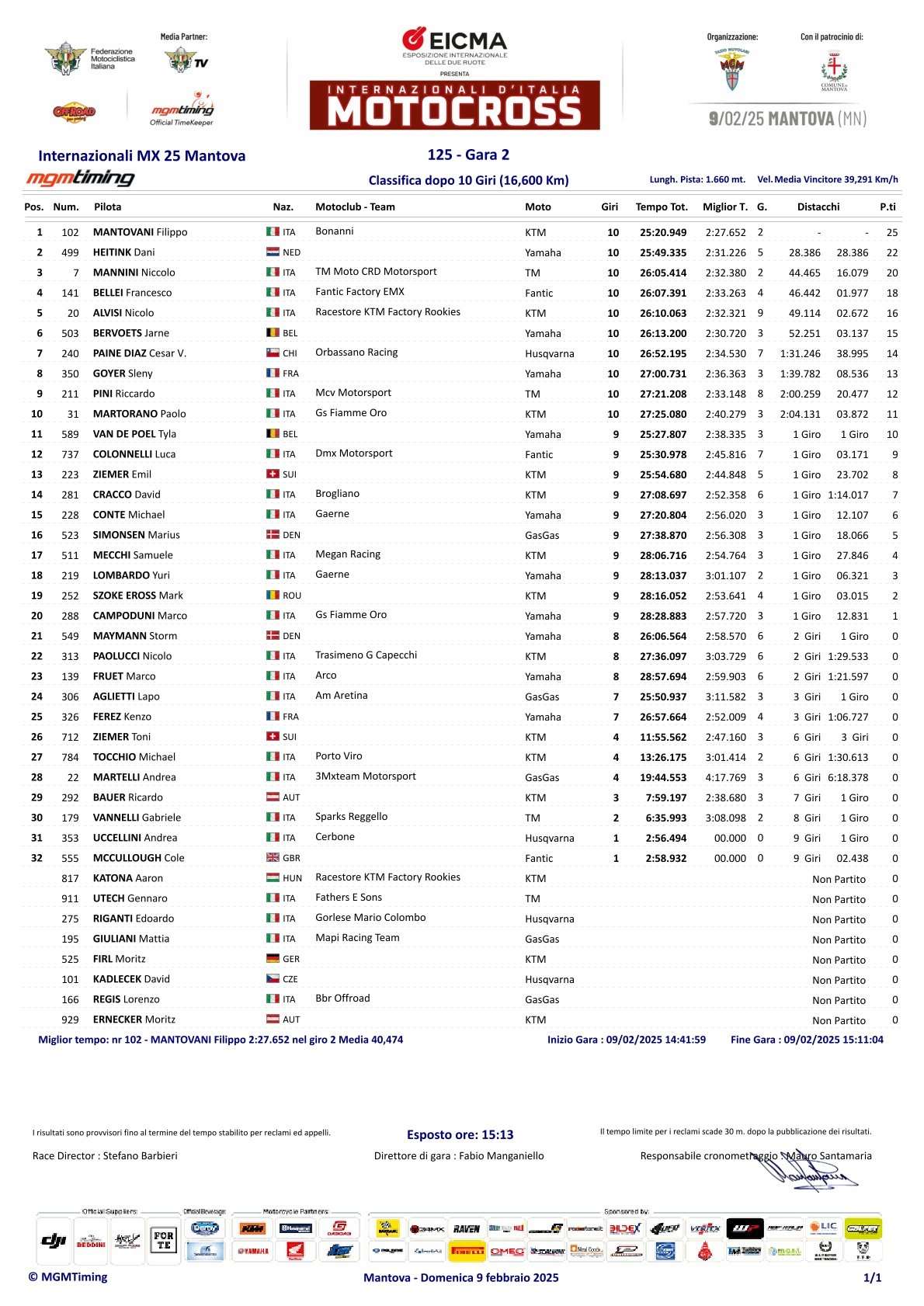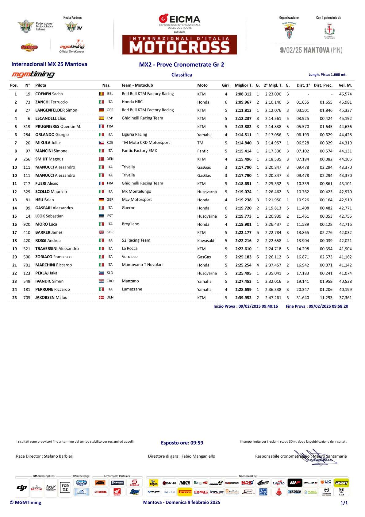 Volg de uitslagen op de volgende link: https://www.mgmtiming.it/default.aspx?pagina=/2025/_C._Internazionali%20d%20Italia_Motocross_Pro/2025-02-09%20Mantova