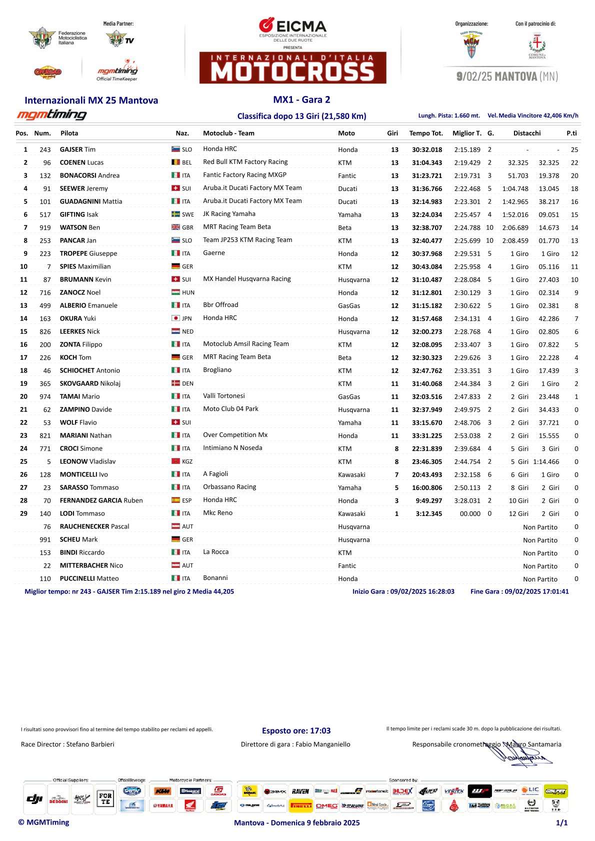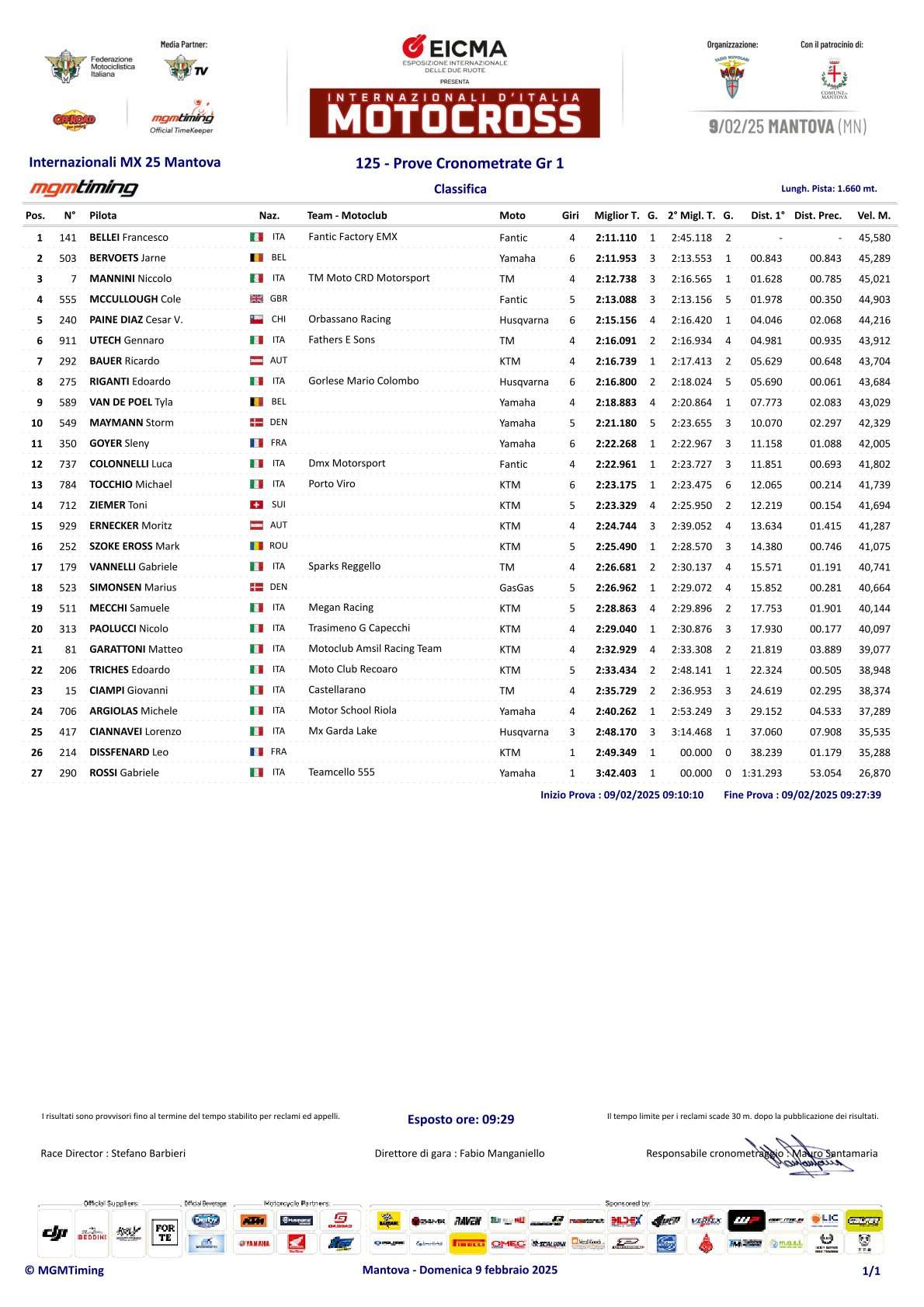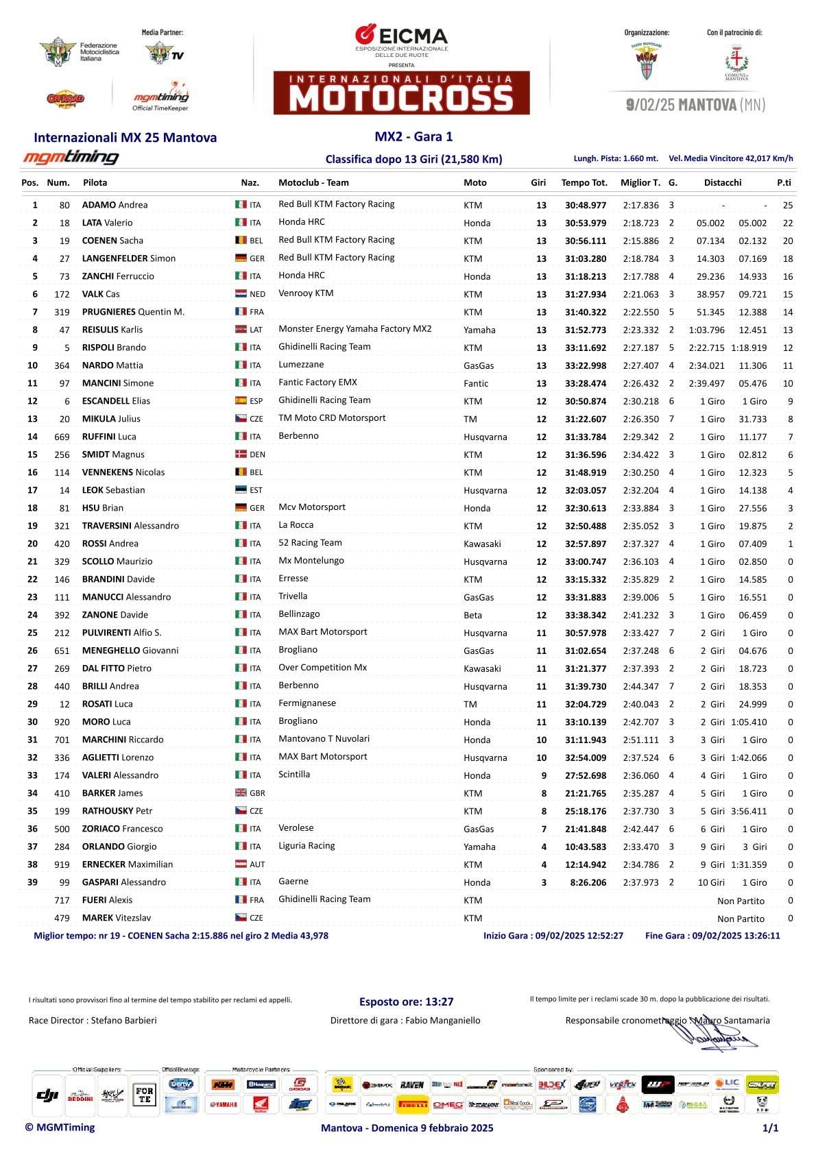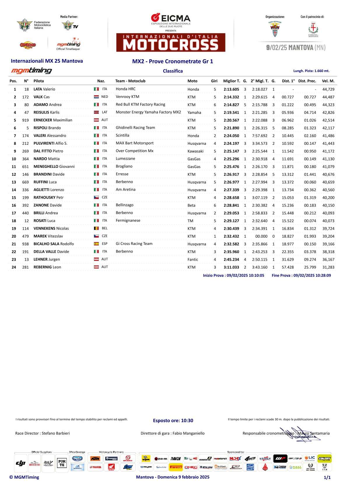 Volg de uitslagen op de volgende link: https://www.mgmtiming.it/default.aspx?pagina=/2025/_C._Internazionali%20d%20Italia_Motocross_Pro/2025-02-09%20Mantova