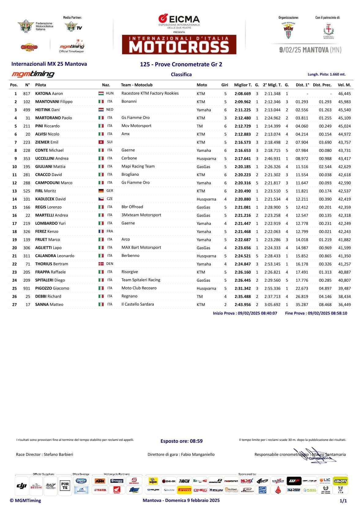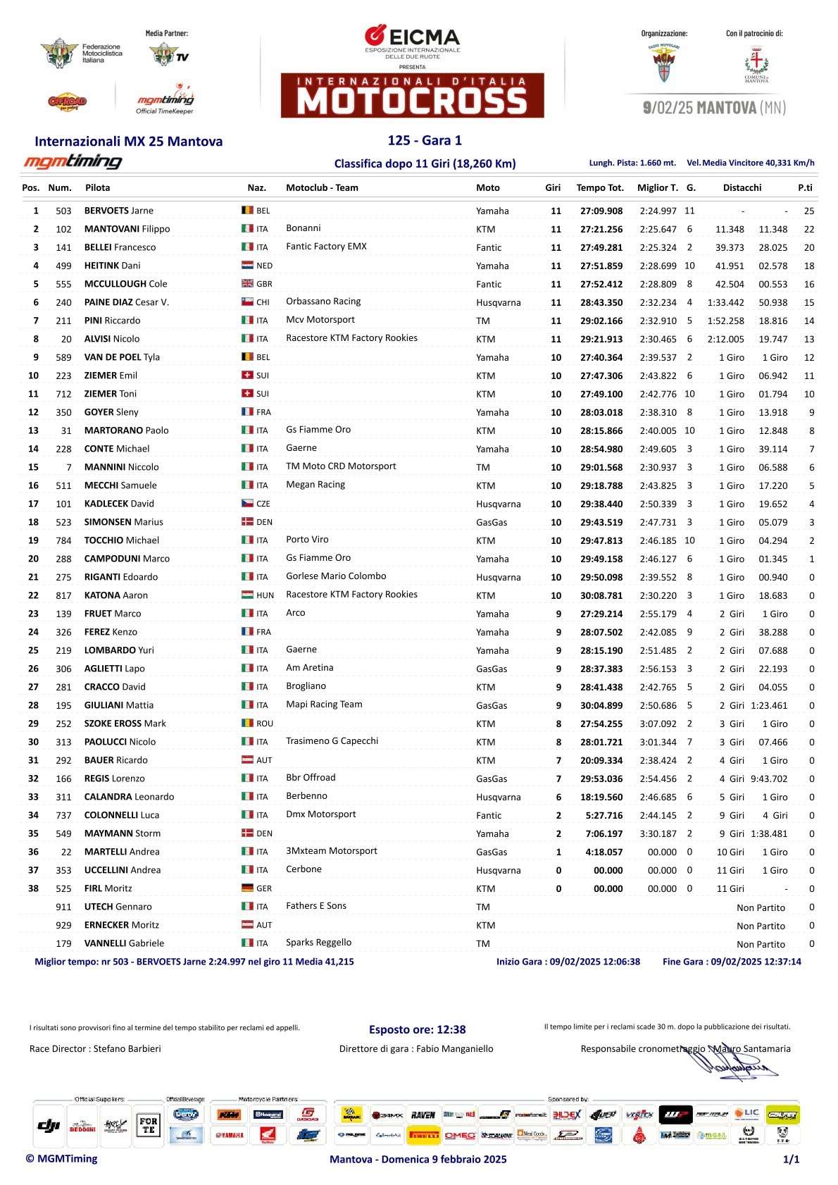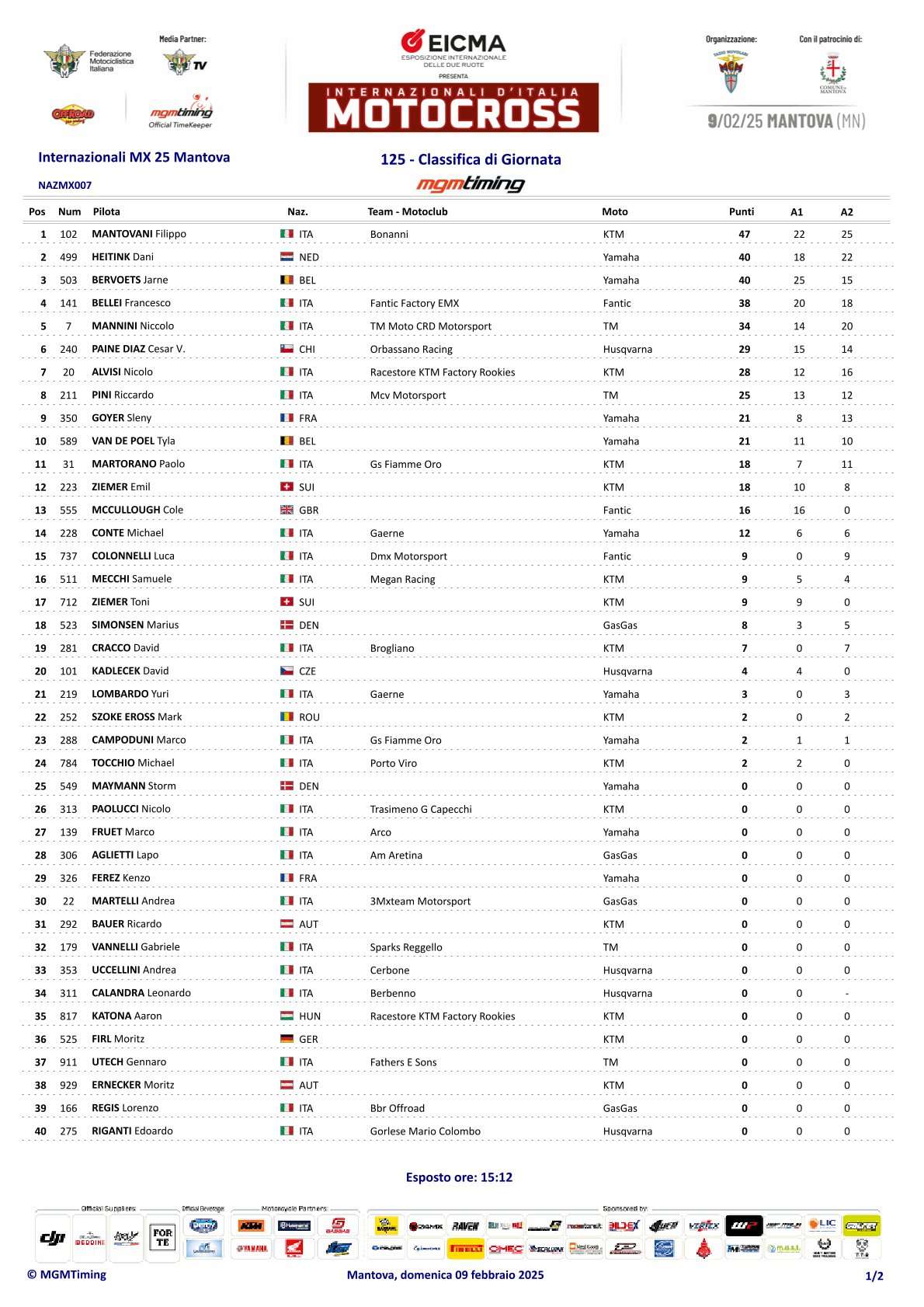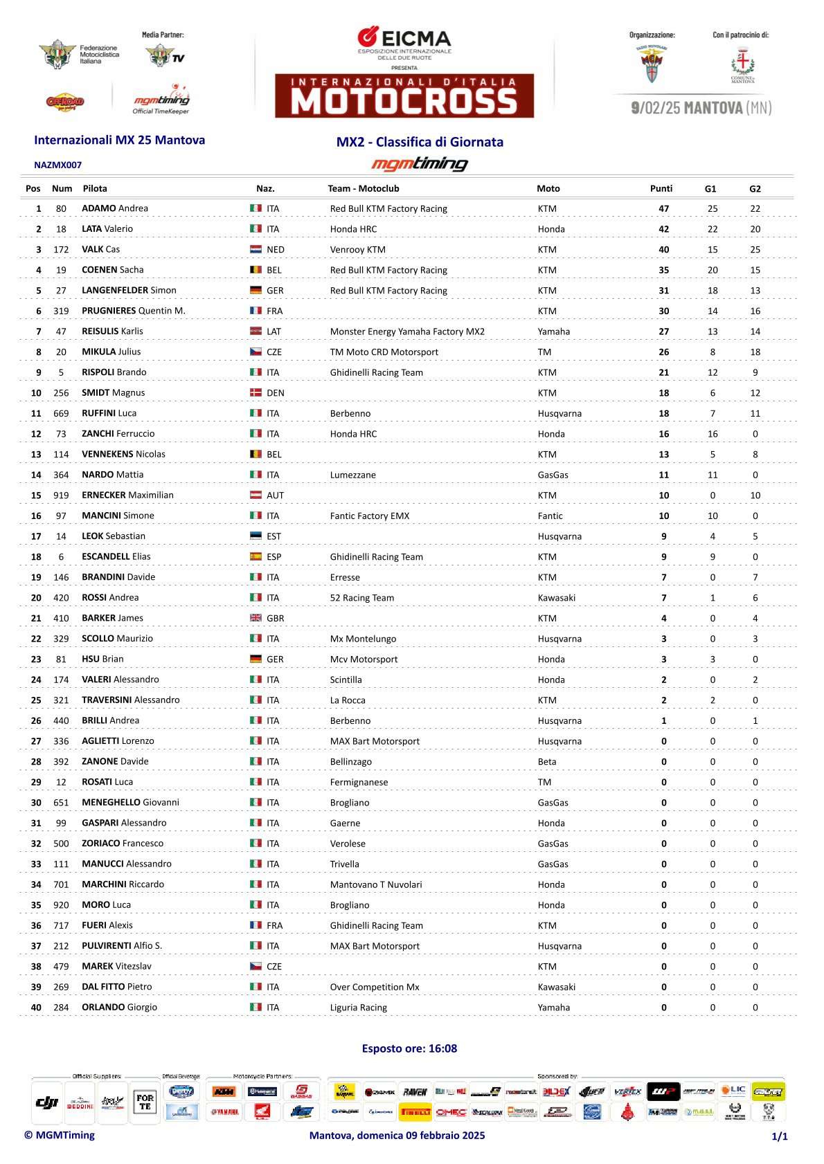 Volg de uitslagen op de volgende link: https://www.mgmtiming.it/default.aspx?pagina=/2025/_C._Internazionali%20d%20Italia_Motocross_Pro/2025-02-09%20Mantova