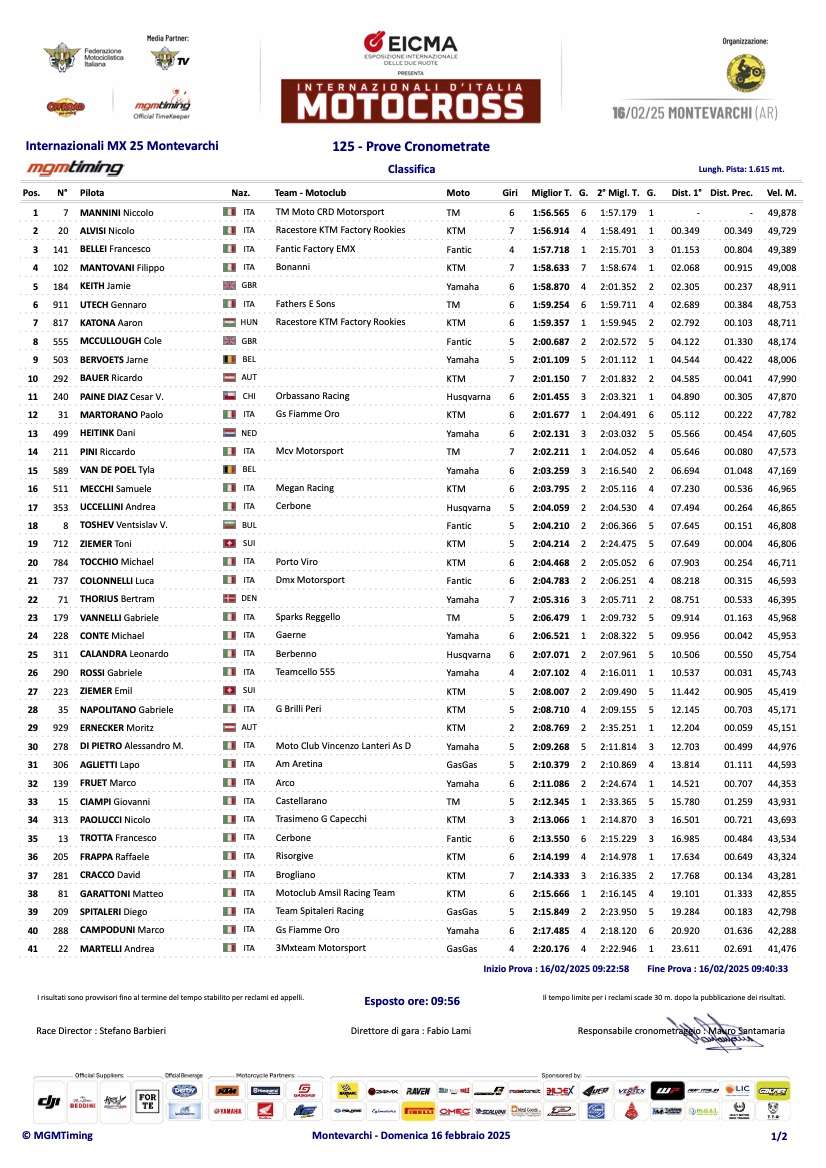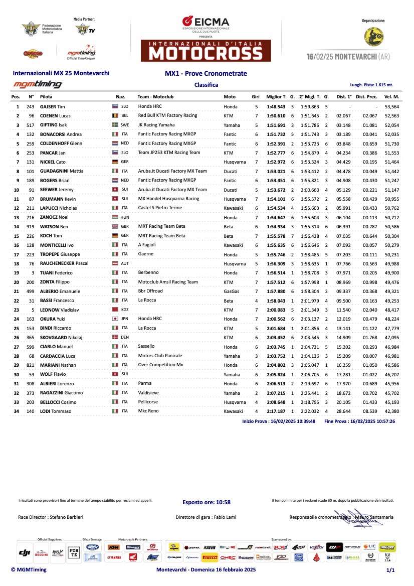 Gajser, Valk en Mannini pakken pole position in Montevarchi by motocrossplanet16 februari 2025 Tim Gajser, Cas Valk en Niccolo Mannini hebben tijdens de tweede wedstrijd van het Italiaans Kampioenschap de snelste tijden in de kwalificaties neer weten te zetten. Bekijk hieronder de volledige uitslagen: