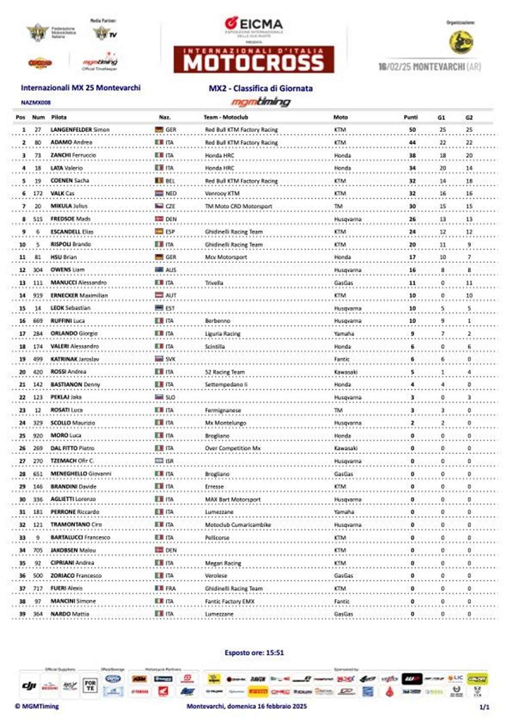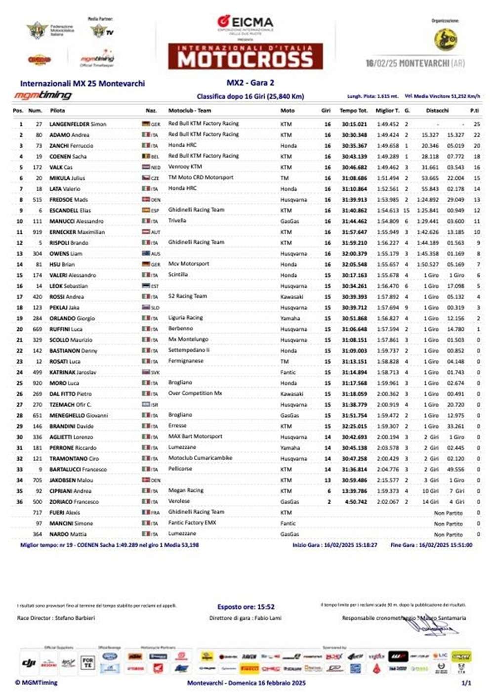 Simon Laengenfelder heeft beide manches van het Italiaans Kampioenschap MX2 in Montevarchi gewonnen. In de tweede manche was het Sacha Coenen die gelijk de leiding nam en een aantal ronden aan de leiding reed. Daarna nam Ferruccio Zanchi het commando over maar die kwam kort daarna ten val. Simon Laengenfelder kreeg de koppositie in handen en ondanks de druk van Andrea Adamo hield hij het hoofd koel tot aan de finish.