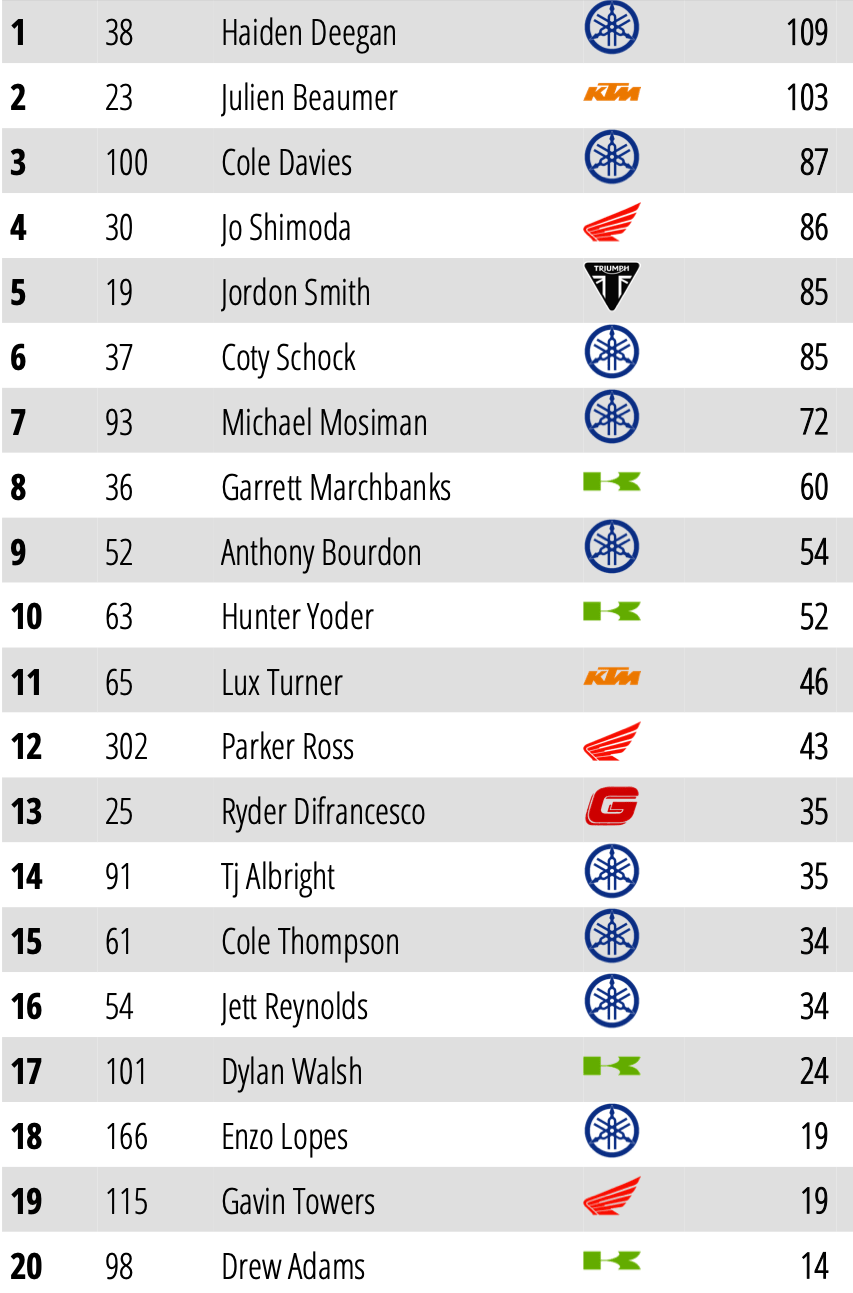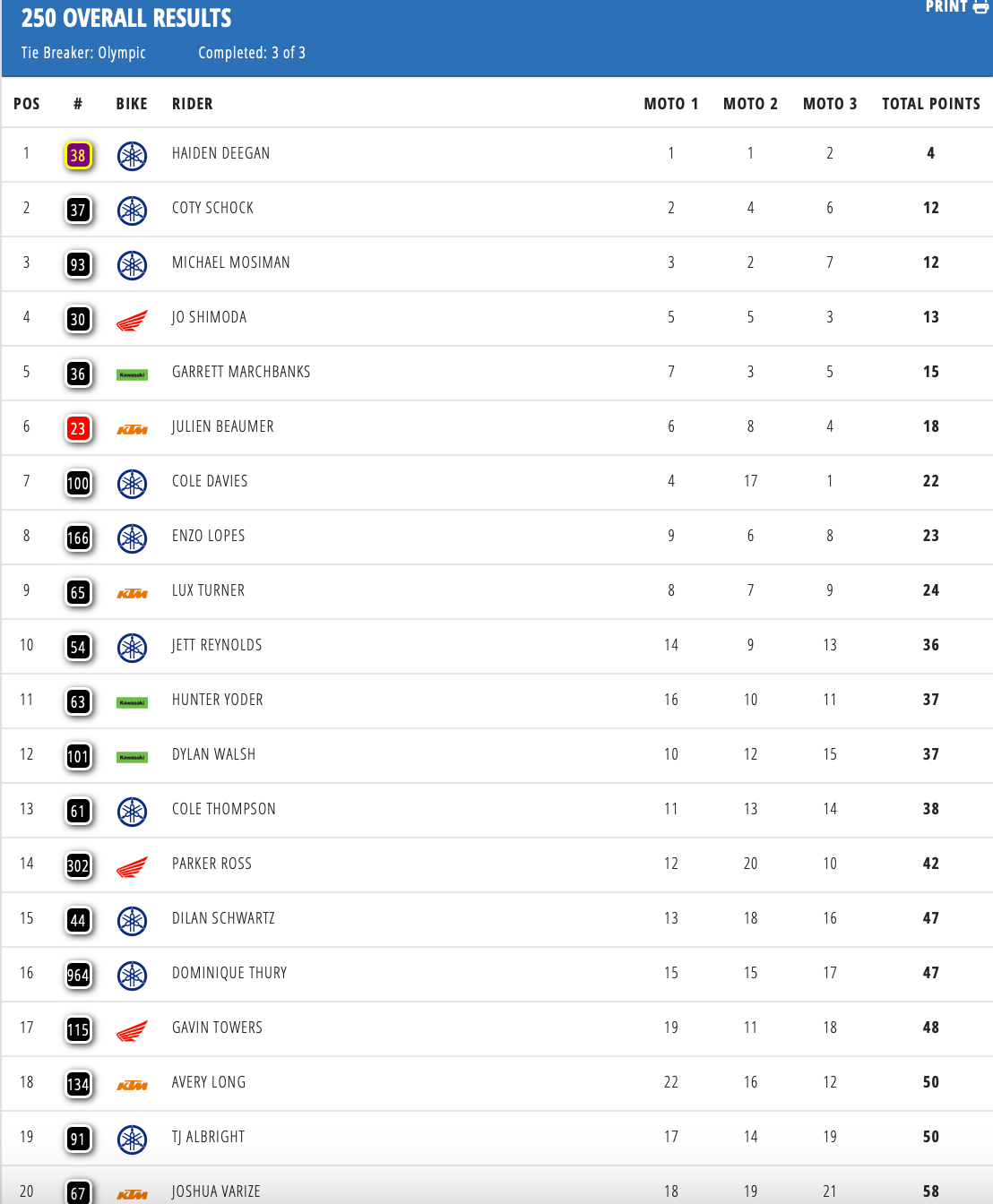 In de 250 klasse won Haiden Deegan de wedstrijd met een 1-1-2 in de finales voor Coty Shock 2-4-6 en Michael Mosiman 3-2-7. Jo Shimoda en Garrett Marchbanks eindigden op een vierde en vijfde plaats. Omdat Julien Beaumer niet verder kwam dan een zesde plaats heeft hij de leiding in de tussenstand af moeten geven aan Deegan, die nu een voorsprong heeft van 6 punten. Cole Davies staat derde en heeft een achterstand van 22 punten!