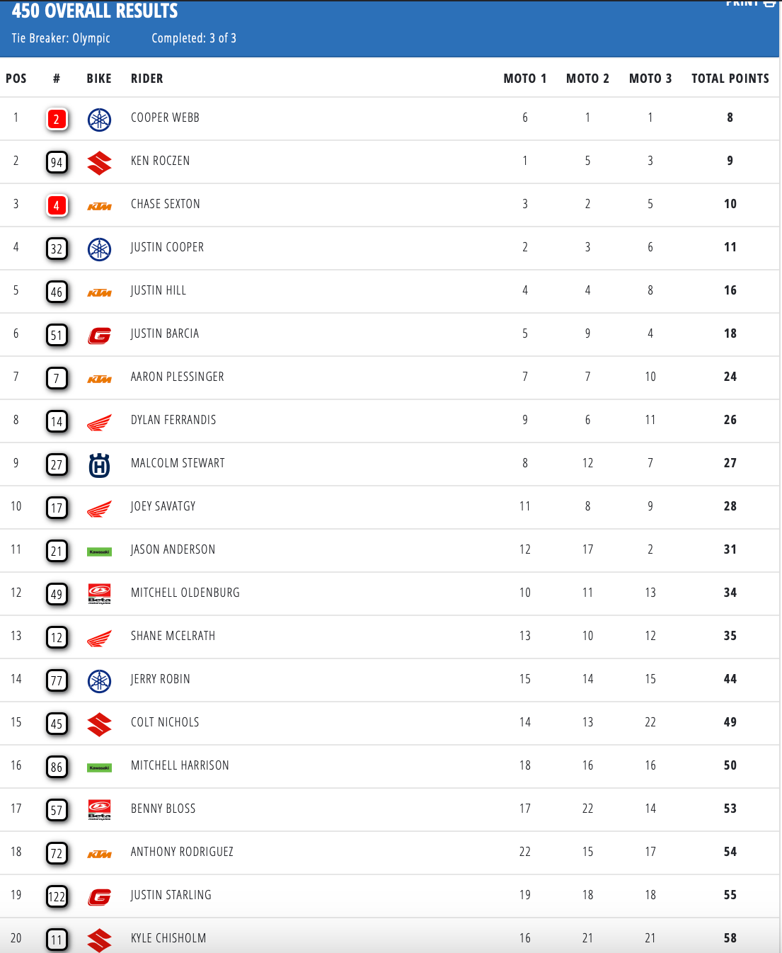 In de 450 klasse was het spannend maar uiteindelijk was het Webb die met een 6-1-1 de minste punten pakte en won voor Ken Roczen 1-5-3 en Chase Sexton 3-2-5. Justin Cooper en Justin Hill maakten de top vijf compleet.