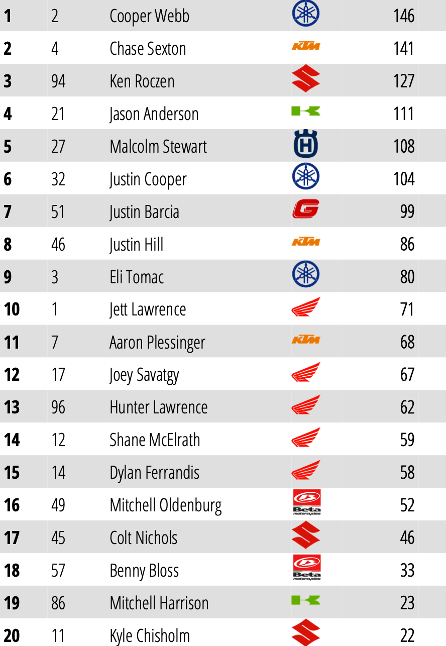 Door de zege van Webb heeft hij nu alleen de leiding in de tussenstand van het kampioenschap in handen. Zijn voorsprong op Sexton bedraagt 5 punten en Roczen volgt op 19 punten.