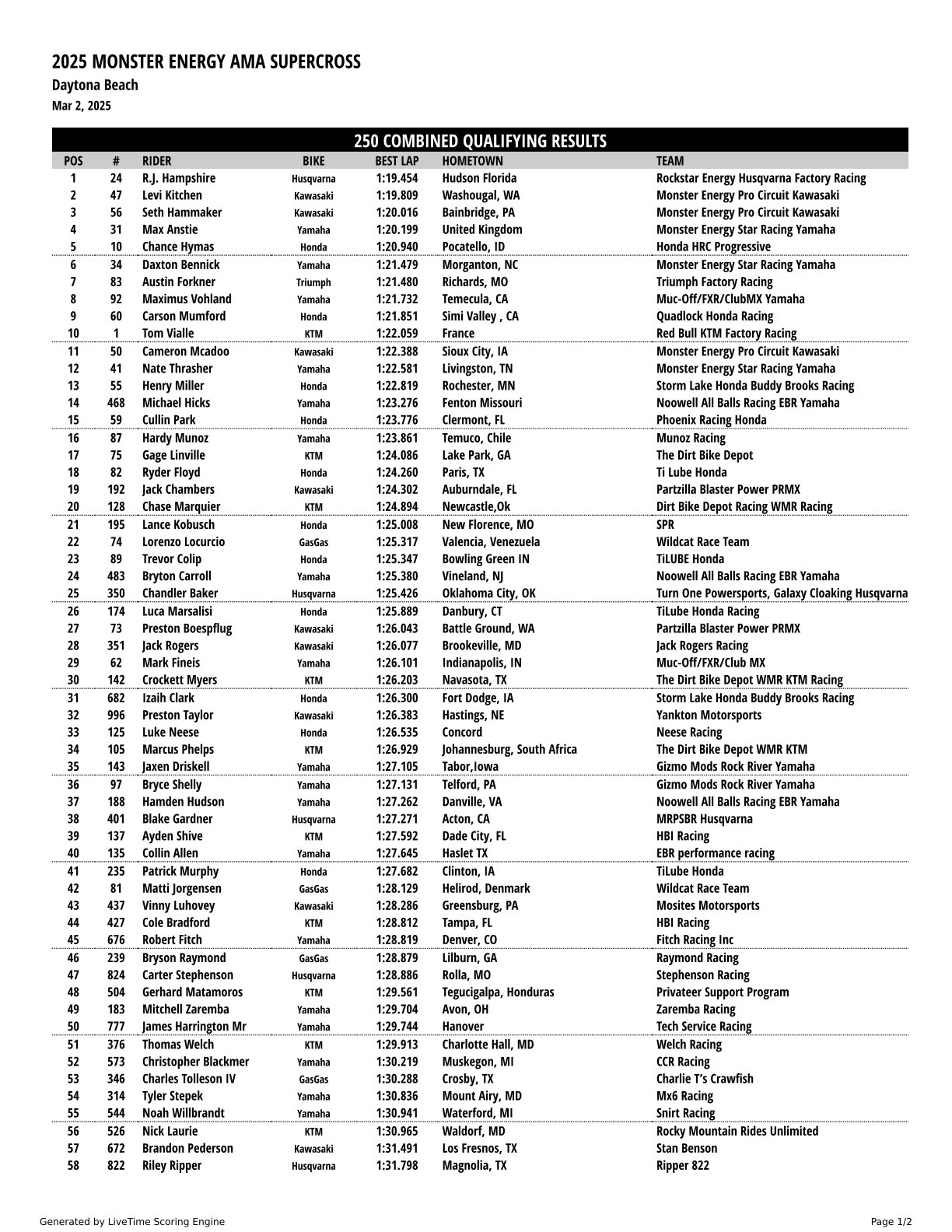 Hampshire en Cooper pakken pole position in Daytona by motocrossplanet1 maart 20251 maart 2025 RJ Hampshire en Justin Cooper hebben in de kwalificaties van de supercross in Daytona de snelste tijd op de klok weten te zetten. Bekijk de tijden hieronder: Photocredits – Align Media