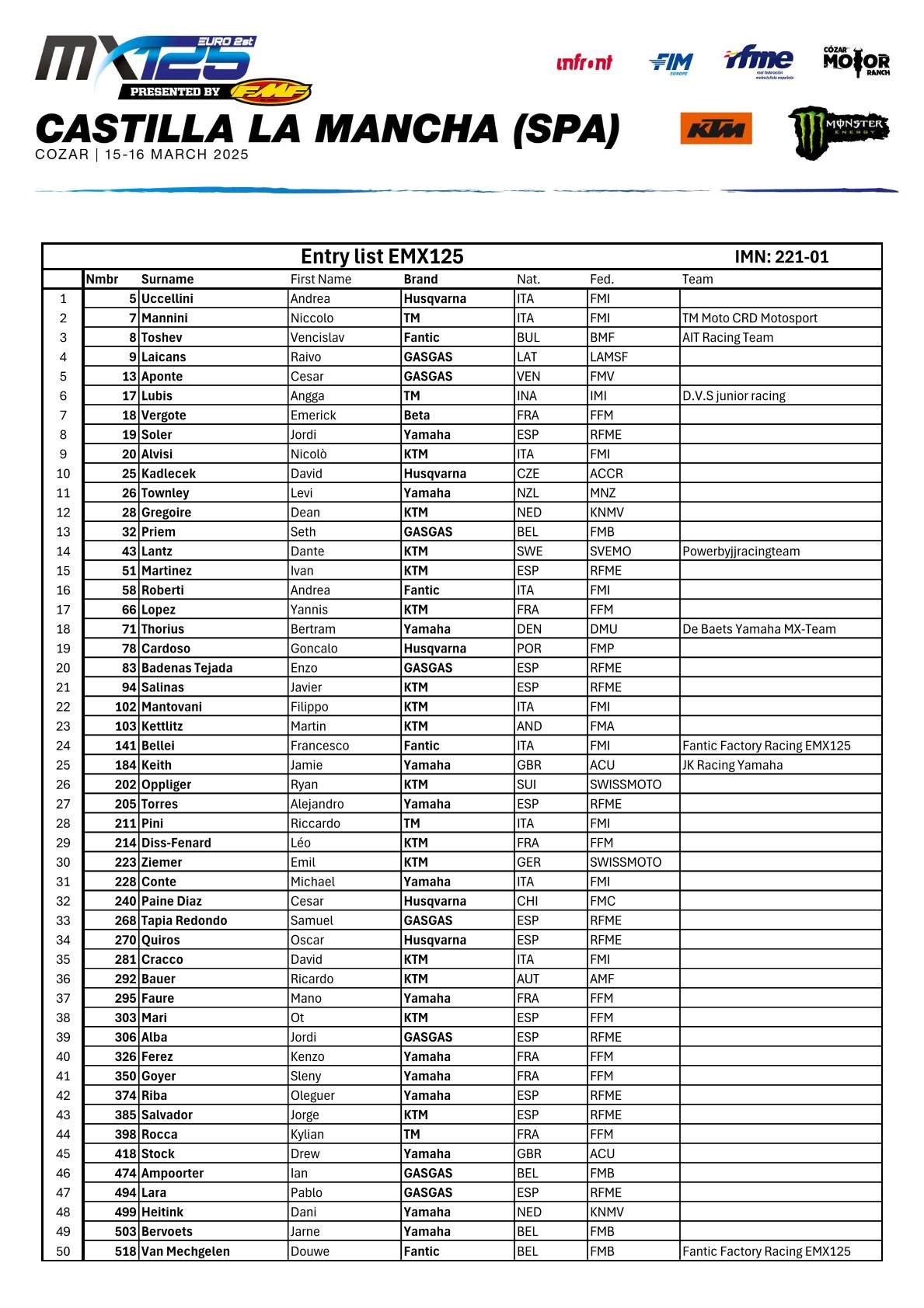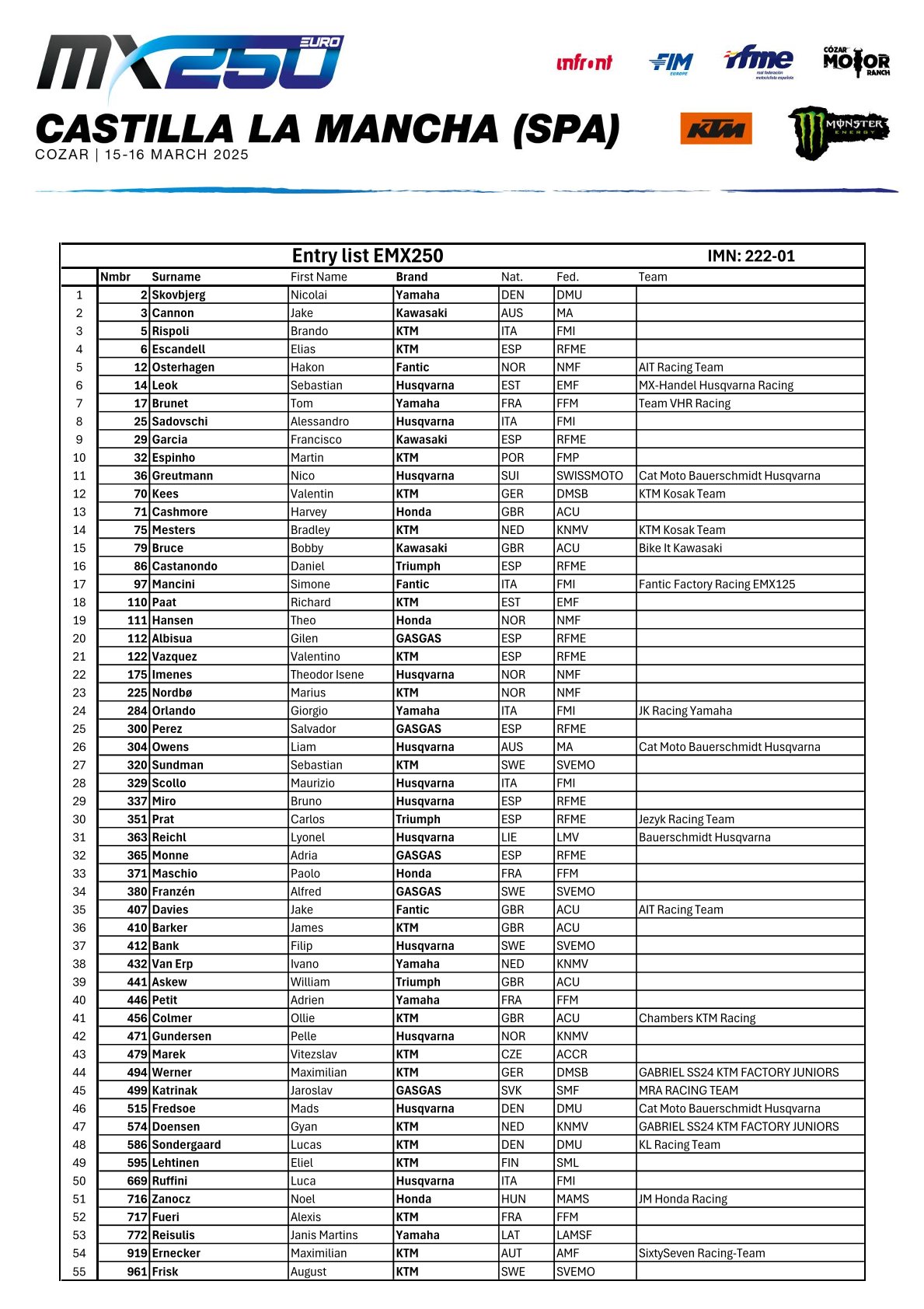 Aankomend weekend wordt de tweede wedstrijd van het wereldkampioenschap verreden in Cozar, Spanje! Naast de MXGP en MX2 klasse rijden hier ook de EMX125 en EMX250 klasse! Bekijk hieronder het tijdschema en de deelnemerslijsten: