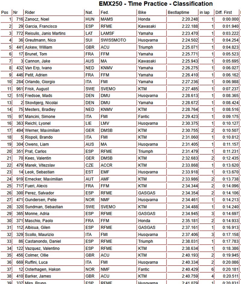 Zanocz snelste in tijdtraining EMX250 Spanje by motocrossplanet15 maart 202515 maart 2025 Noël Zanocz heeft in de tijdtraining van de EMX250 klasse in Spanje de snelste tijd op de klok gezet. Francesco Garcia kwam tot een tweede tijd voor Janis Martins Reisulis! Tijdtraining EMX250: @shotbybavo