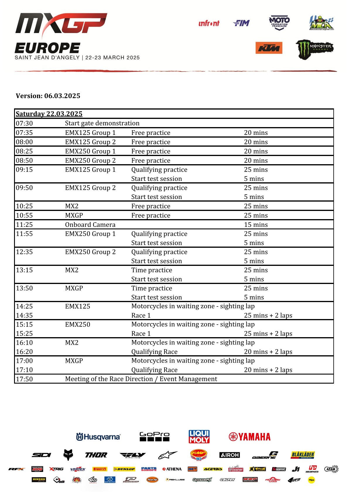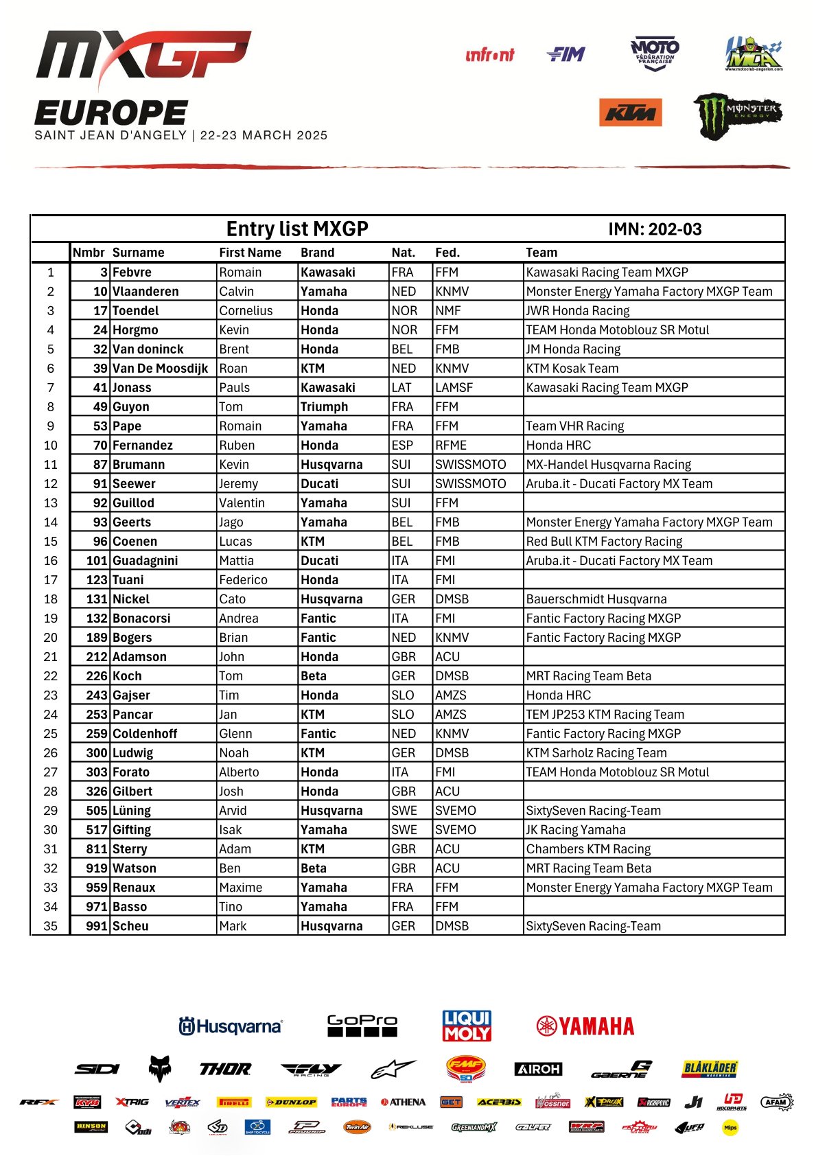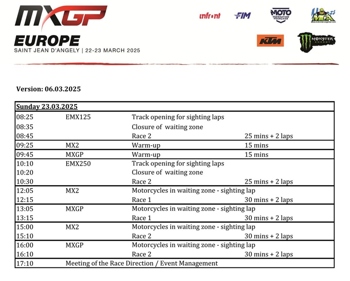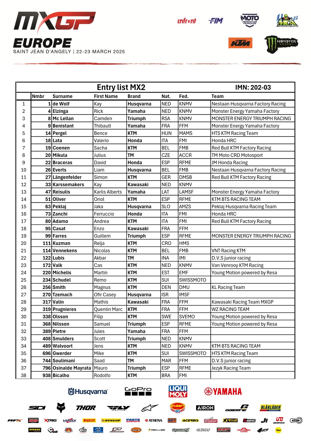 Aankomend weekend wordt de derde wedstrijd van het wereldkampioenschap MXGP verreden in het Franse St. Jean d’Angely. Naast de MXGP en MX2 klasse rijden ook de EMX250 en EMX125 klasse hier een wedstrijd om de punten. Wie er aan de start staan, zie je hieronder: