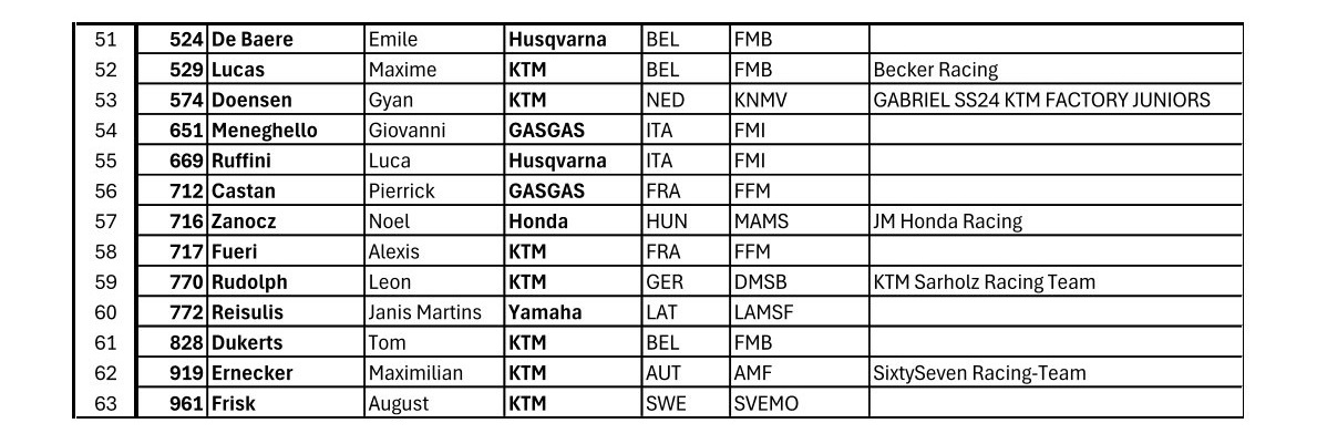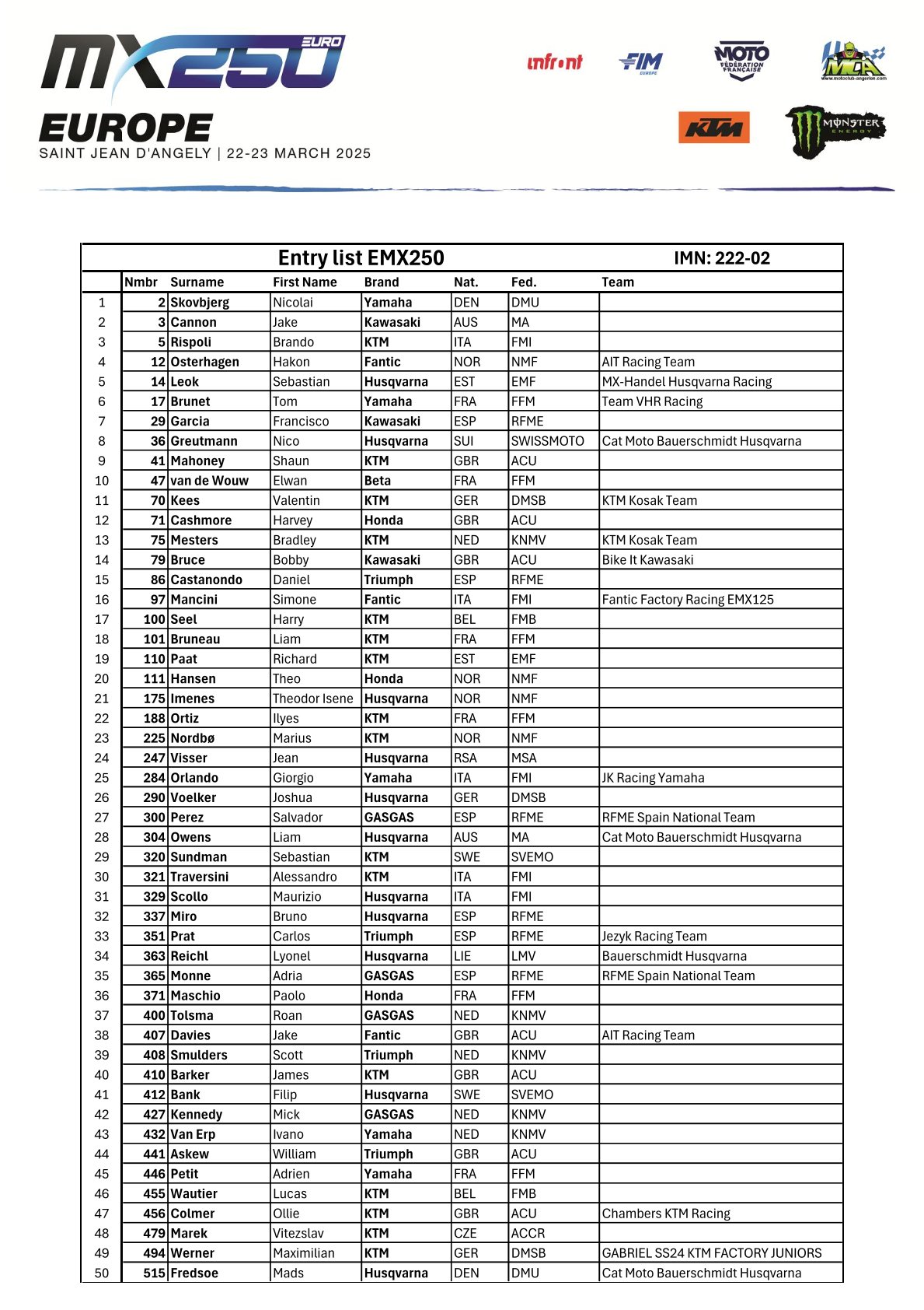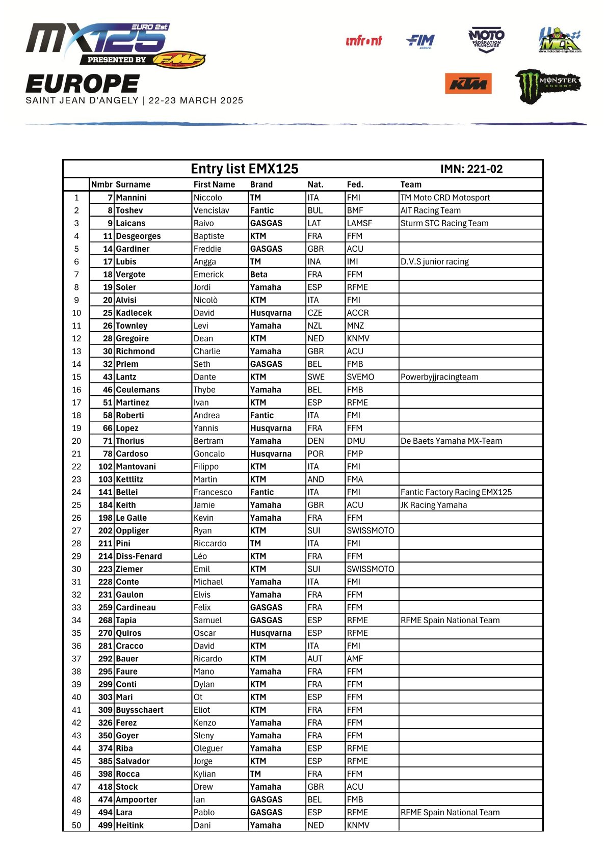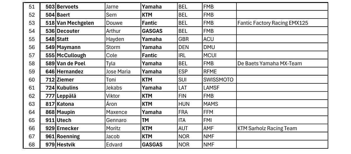 EMX125 PRESENTED BY FMF RACING ENTRY LIST