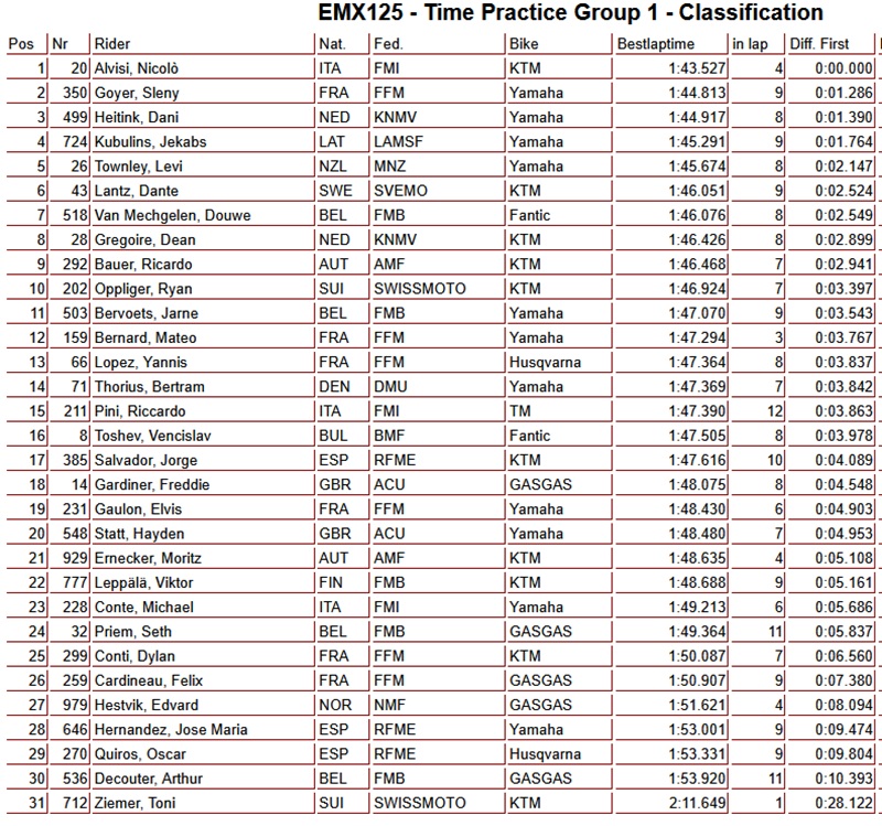 Alvisi en Katona snel in tijdtraining EMX125 Frankrijk by motocrossplanet22 maart 202522 maart 2025 Nicolo Alvisi en Aron Katona hebben in de tijdtraining van de EMX125 klasse in Frankrijk de snelste tijd op de klok gezet. Bekijk hieronder de tijden: Photocredits – Juan Pablo Acevedo