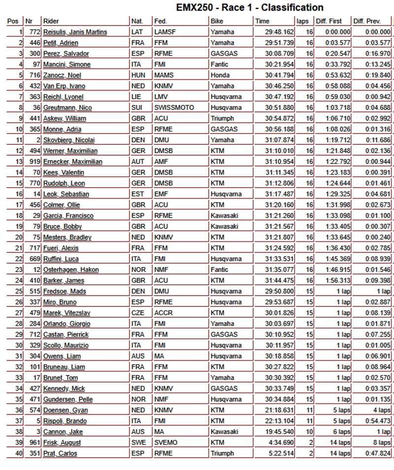 Janis Reisulis heeft de eerste manche van de EMX250 klasse in Frankrijk gedomineerd. Reisulis won de manche voor Adrien Petit en Salvador Perez.