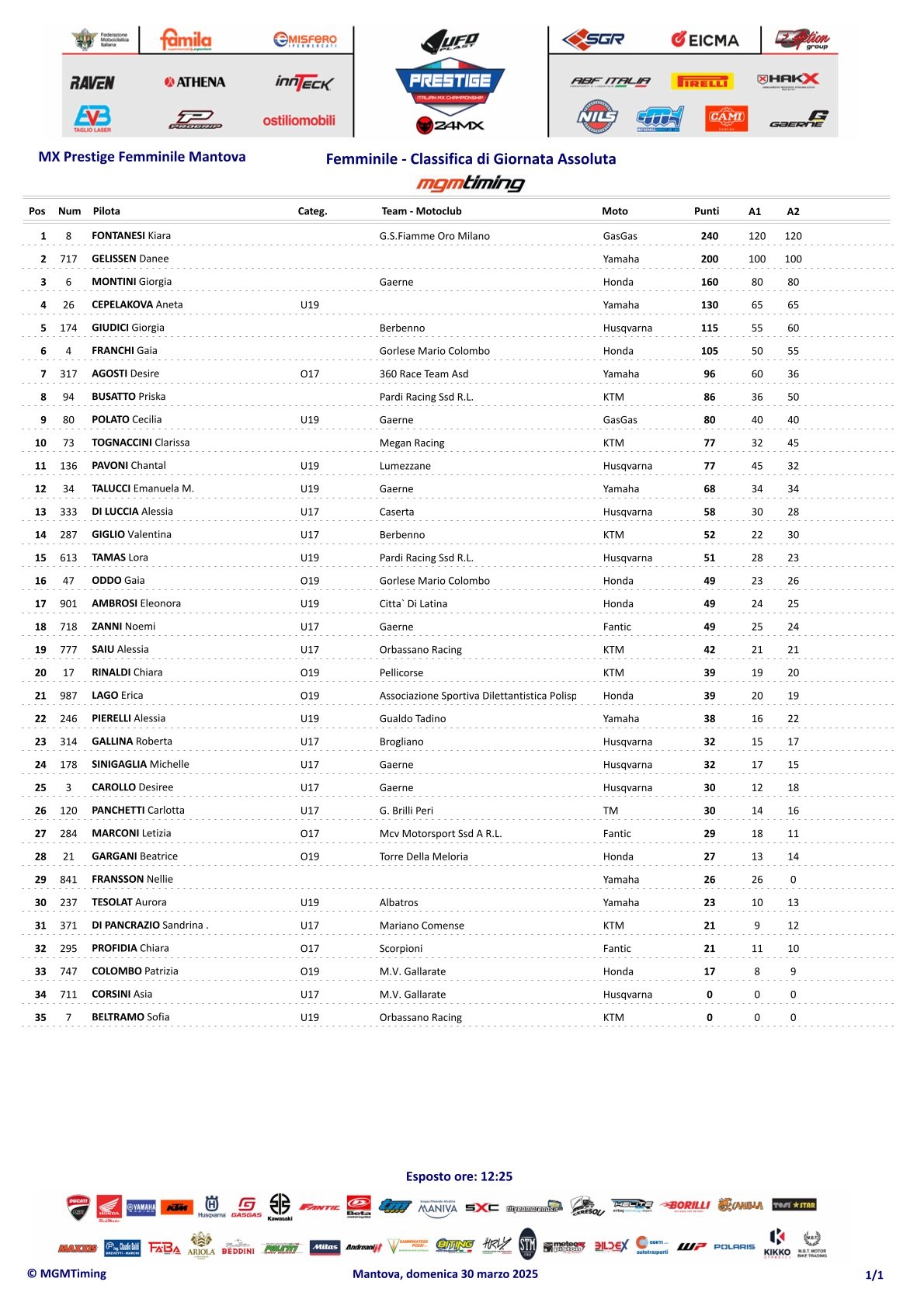 Na haar tweede plaats in de eerste manche van het Italiaans Kampioenschap in Mantova heeft Danee Gelissen hier vandaag in de tweede manche opnieuw een tweede plaats aan toegevoegd. Gelissen kwam wederom achter Kiara Fontanesi over de finish en pakte hiermee de tweede plaats in het dagklassement. Giogia Montini werd derde in het dagklassement.