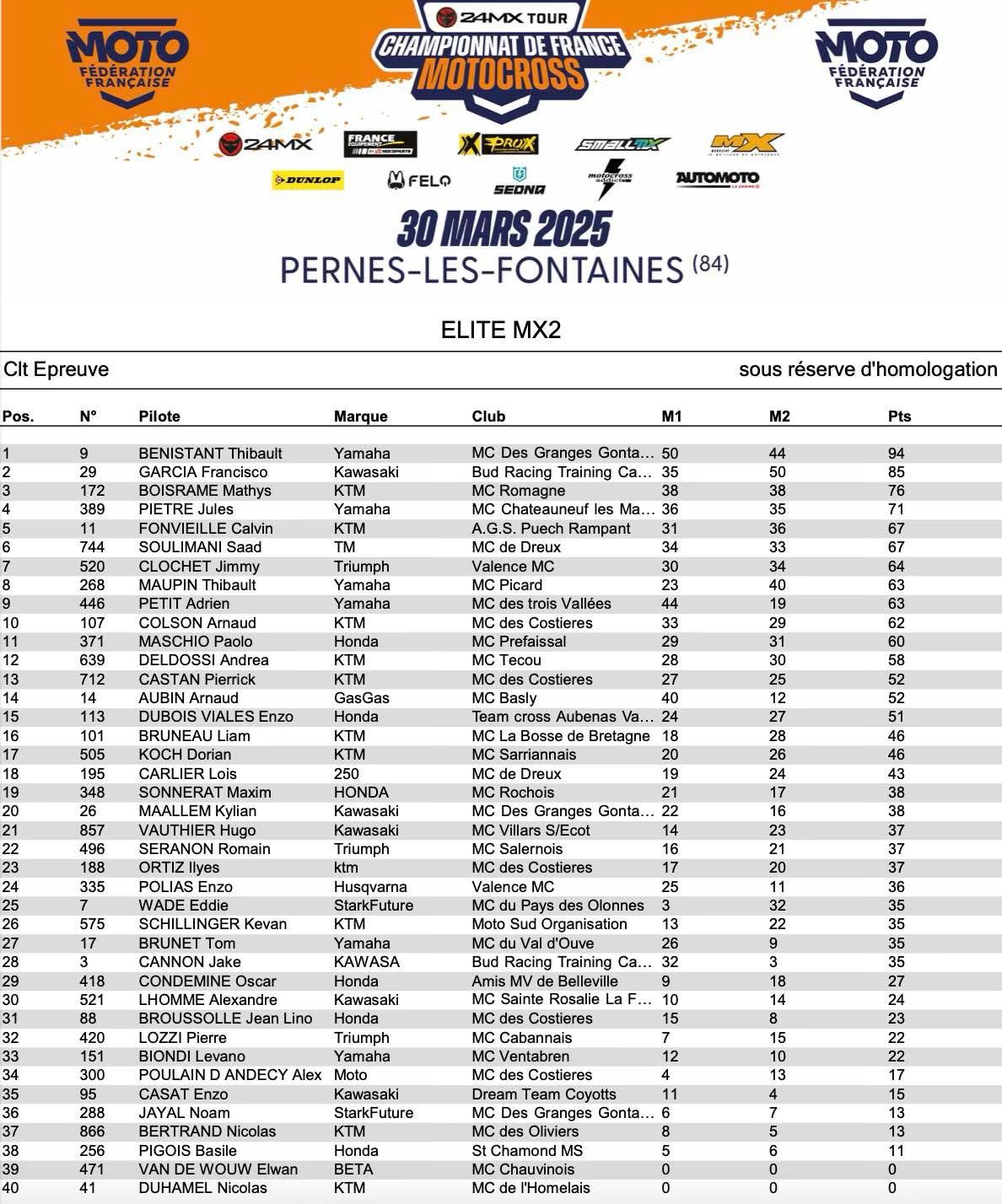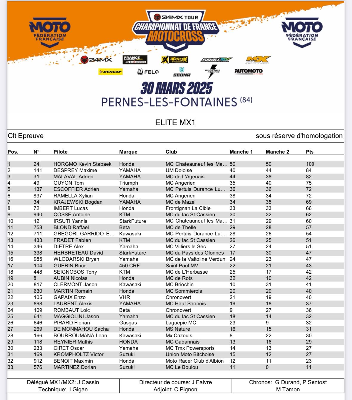 Horgmo en Benistant winnen in Frankrijk by motocrossplanet30 maart 2025 Kevin Horgmo en Thibault Benistant hebben de tweede wedstrijd van het Frans Kampioenschap in Pernes les Fontaines weten te winnen. Bekijk hieronder de volledige uitslagen.