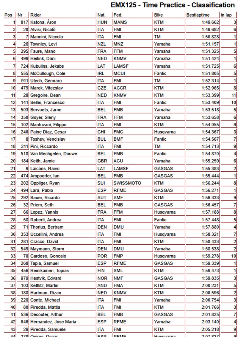 Aron Katona snelste in tijdtraining EMX125 voor Alvisi by motocrossplanet5 april 2025 Aron Katona heeft in de tijdtraining van de EMX125 klasse in Sardinië de snelste tijd neer weten te zetten voor Nicolo Alvisi en Nicolo Manini! Bekijk hieronder de uitslag: –