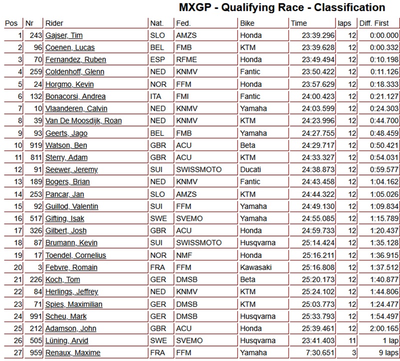 Gajser wint kwalificatieheat MXGP voor Coenen by motocrossplanet5 april 2025 Tim Gajser heeft de kwalificatieheat van de MXGP klasse in Sardinie weten te winnen voor Lucas Coenen, Ruben Fernandez en Glenn Coldenhoff. Bekijk hieronder de volledige uitslag: @shotbybavo
