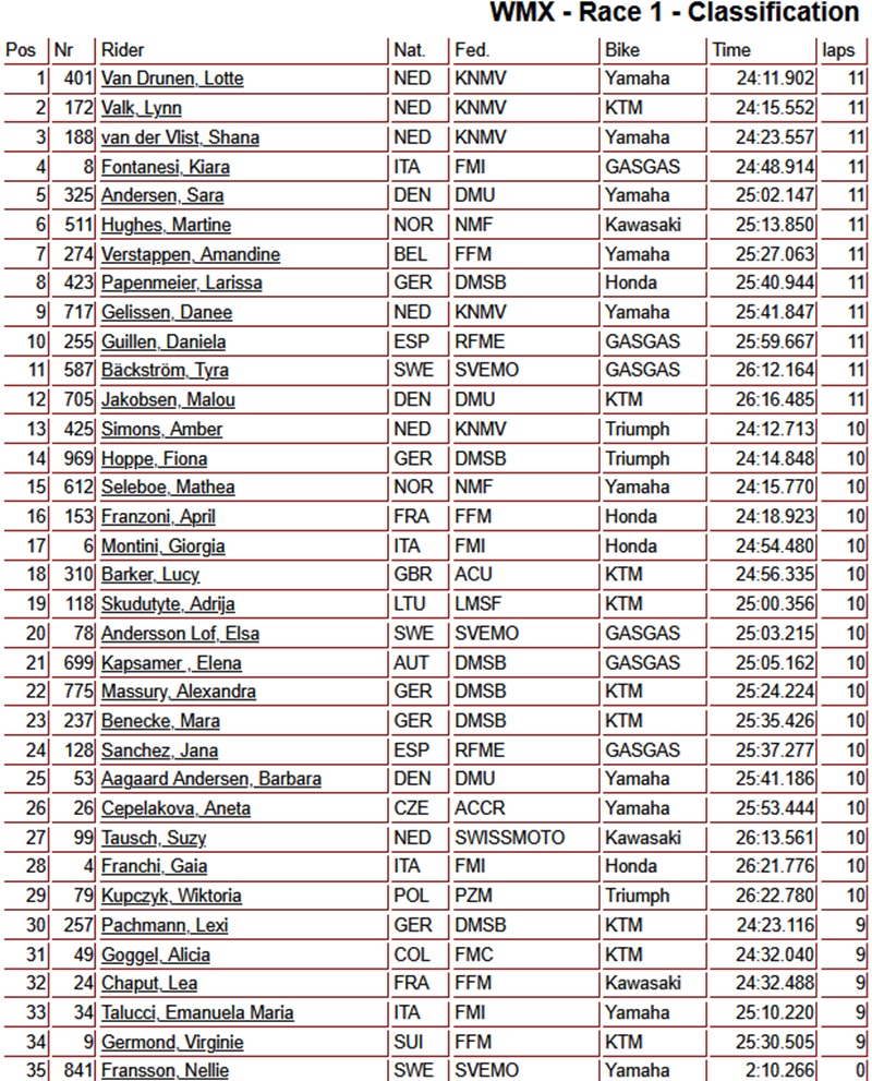 Nederlandse top drie in eerste manche WMX by motocrossplanet5 april 2025 De eerste manche van het WK Dames is gewonnen door Lotte van Drunen voor Lynn Valk en Shana van der Vlist. Daniele Guillen kwam in leidende positie rijdend ten val en viel ver terug! Photocredits Full Spectrum Media