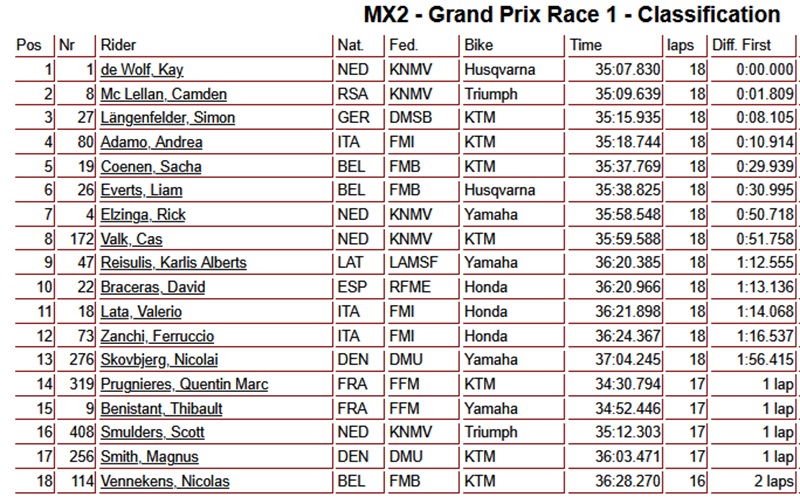 Kay de Wolf heeft de eerste manche van de Grand Prix van Sardinie gewonnen. Sacha Coenen pakte kopstart en leidde in de eerste helft van de wedstrijd voor de Wolf. Net toen de Wolf hem had gepasseerd, kwam Coenen ten val en verloor verschillende plaatsen. Camden McLellan nam de tweede plaats over en hield dit vast tot aan de finish. Simon Laengenfelder werd derde voor Andrea Adamo, Coenen en Liam Everts!