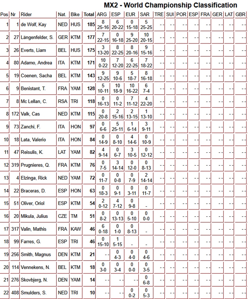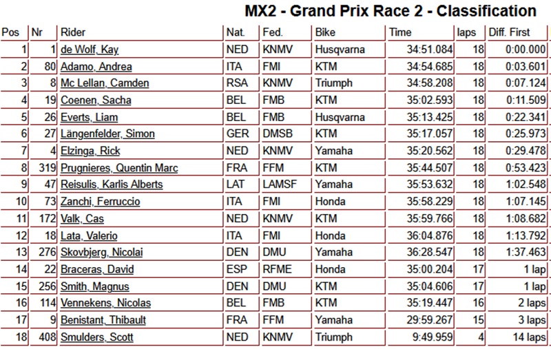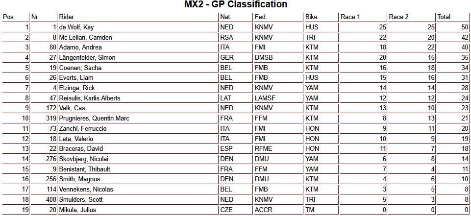 Kay de Wolf heeft beide manches van de Grand Prix van Sardinië weten te winnen. De Wolf reed sterk maar kwam in het midden van de manche ten val. Dit maakte het spannend omdat toen Andrea Adamo de koppositie in handen kreeg. De Wolf vocht zich terug naar voren en nam in de laatste ronde de leiding terug in handen. In het dagklassement won hij voor Camden McLellan en Adamo!