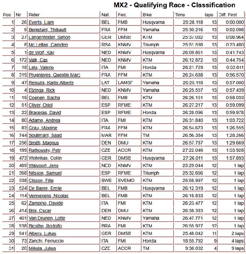 Everts pakt pole position in Arco di Trento by motocrossplanet12 april 2025 Liam Everts heeft na een spannend gevecht met Thibault Benistant de kwalificatieheat van de MX2 klasse gewonnen voor Benistant, Camden McLellan, Kay de Wolf en Cas Valk. Bekijk hieronder de volledige uitslag: Photocredits – Fullspectrum Media