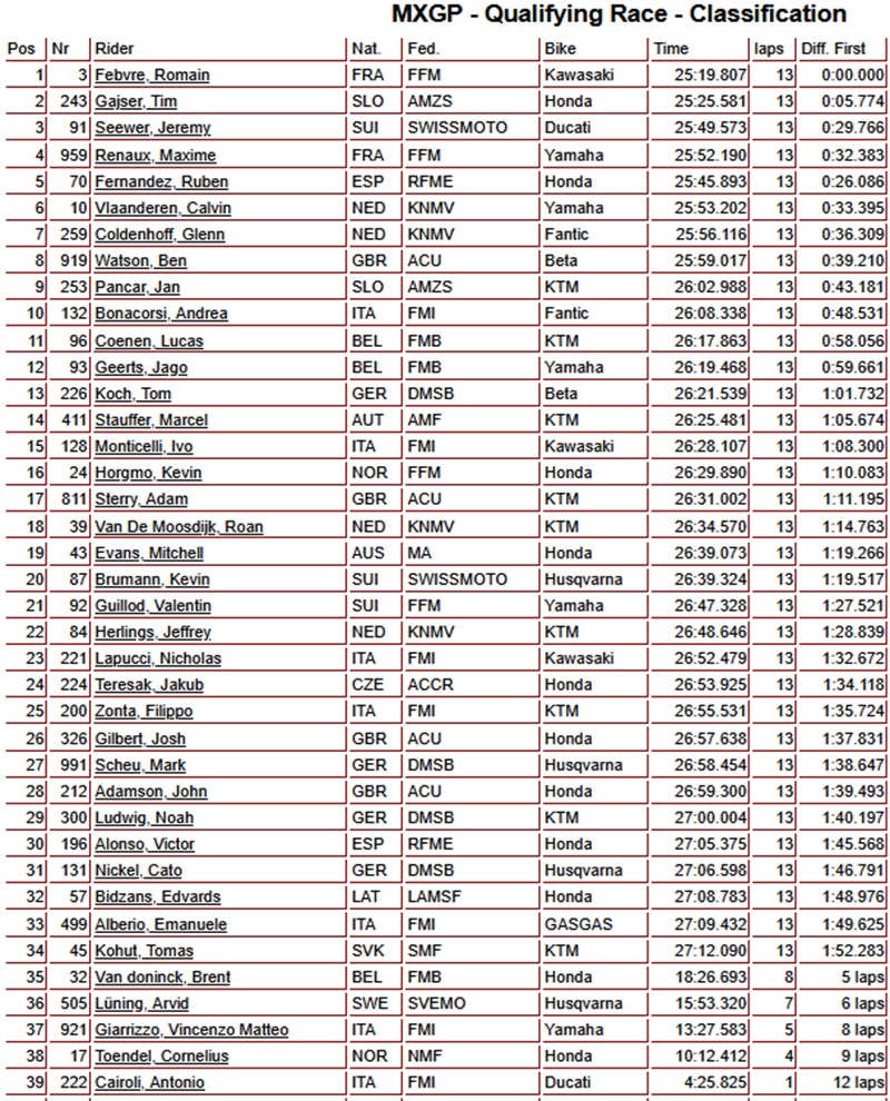 Romain Febvre wint kwalificatieheat MXGP in Trentino by motocrossplanet12 april 202512 april 2025 De Fransman Romain Febvre heeft op sterke wijze de kwalificatieheat van de MXGP klasse in Trentino weten te winnen. Bekijk de volledige uitslag hieronder; Photocredits – Fullspectrum Media