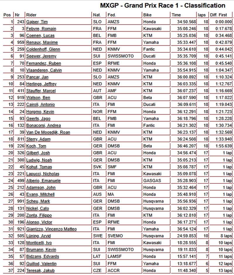 Tim Gajser heeft de eerste manche van de MXGP klasse in Arco di Trento gewonnen. Gajser vocht een spannend duel uit met Romain Febvre maar wist stand te houden tot aan de finish. Febvre viel in de slotfase waardoor hij Gajser vrij baan gaf en tweede werd. Lucas Coenen kwam als derde binnen voor Maxime Renaux en Glenn Coldenhoff.