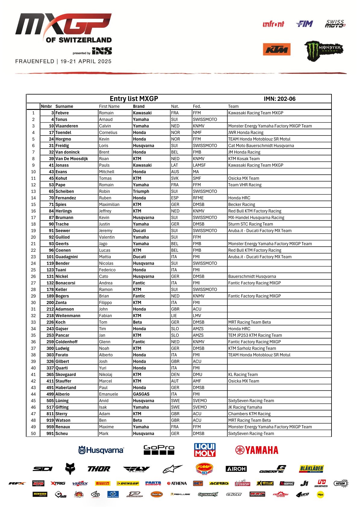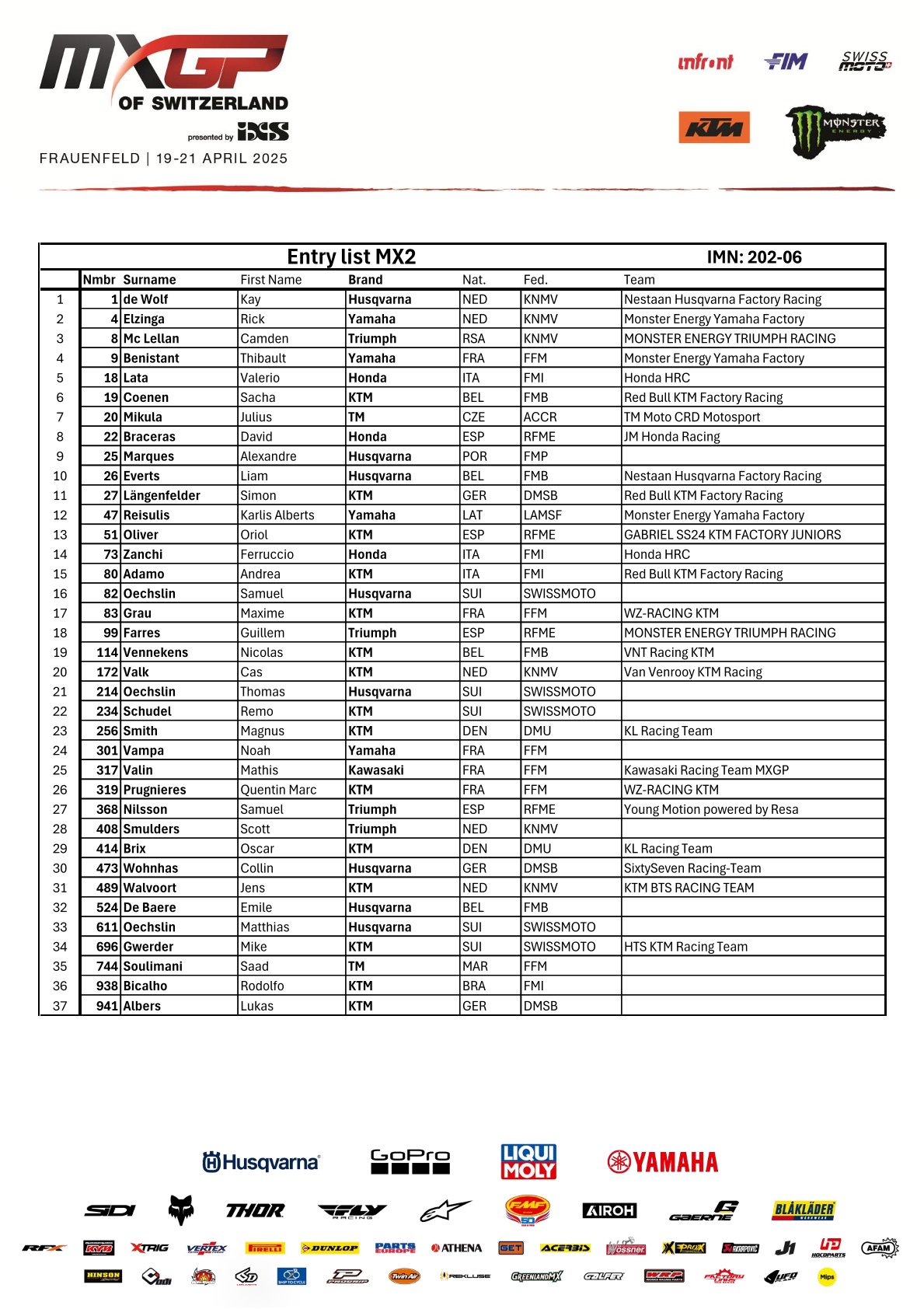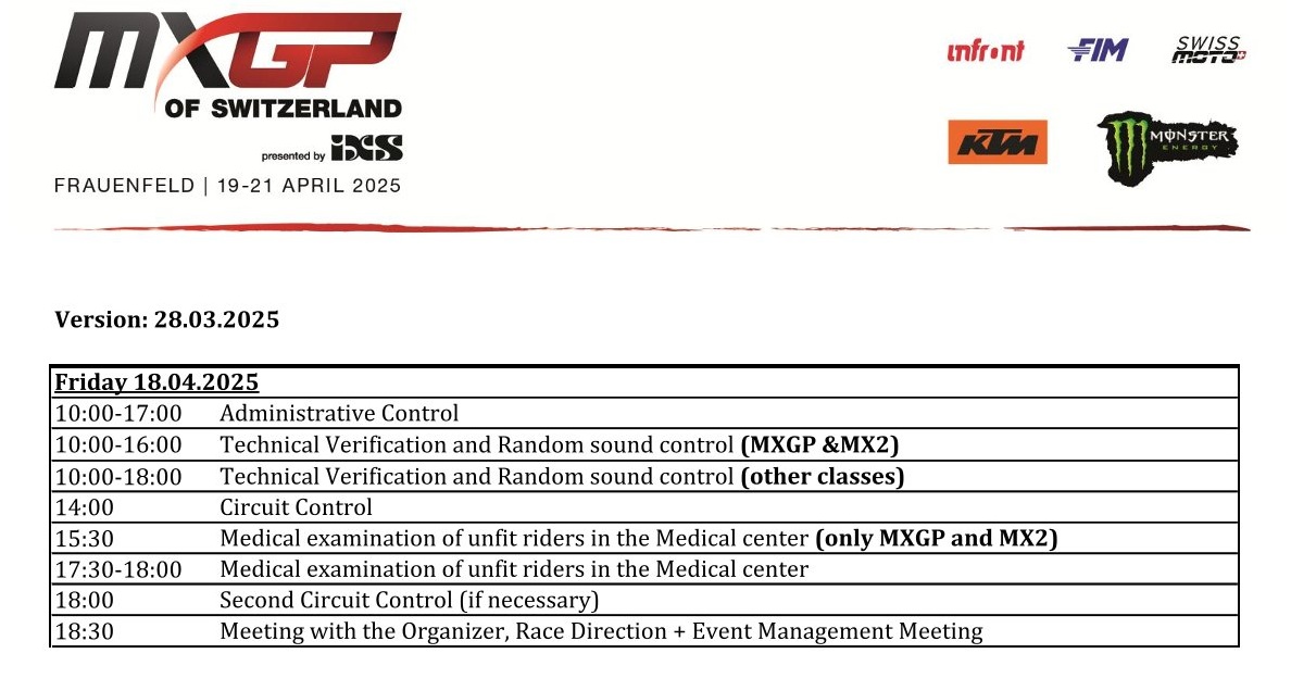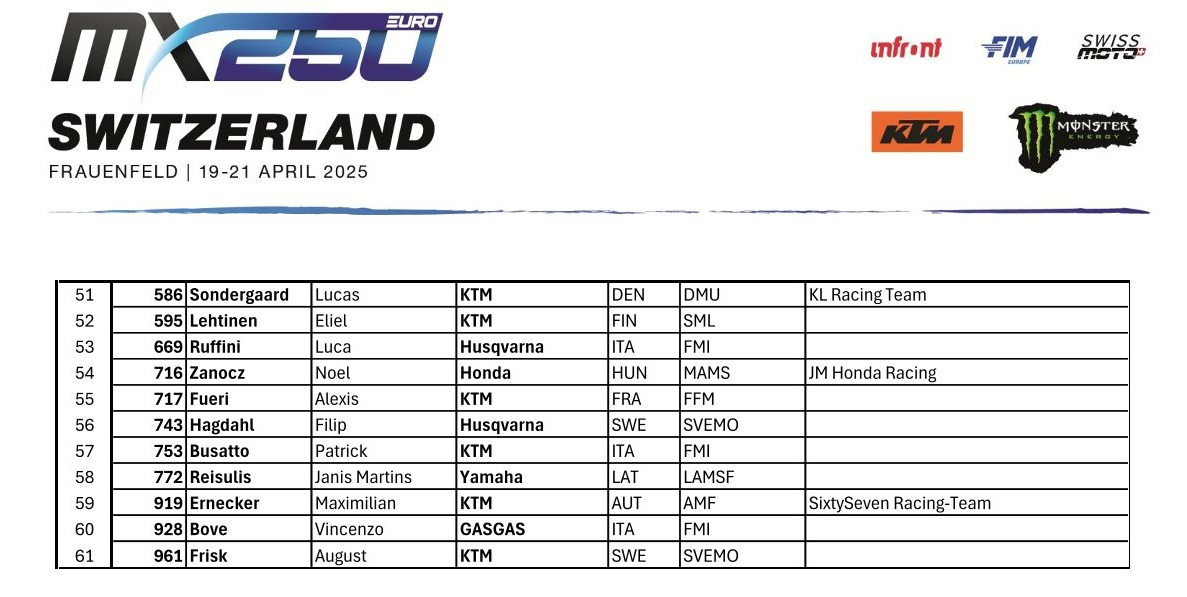 Wie staan er aan de start bij de MXGP in Zwitserland by motocrossplanet14 april 2025 Het wereldkampioenschap gaat in een sneltreinvaart verder met aankomend weekend alweer de zesde wedstrijd in het Zwitserse Frauenfeld. Wie er allemaal mee doen zie je op de deelnemerslijsten! TIMETABLE MXGP ENTRY LIST MX2 ENTRY LIST EMX 250 ENTRY LIST EMX 125 ENTRY LIST Photocredits – MXGP
