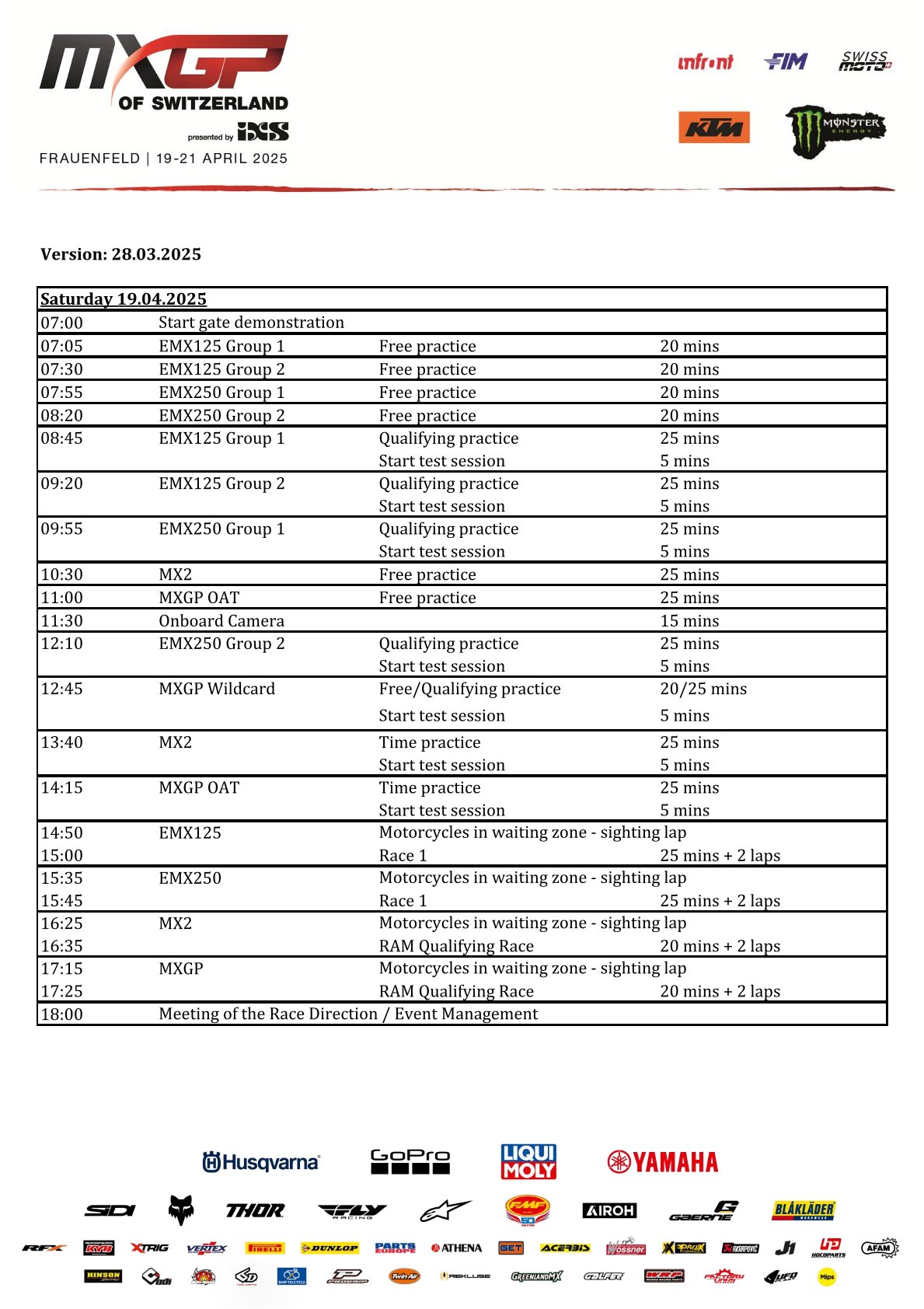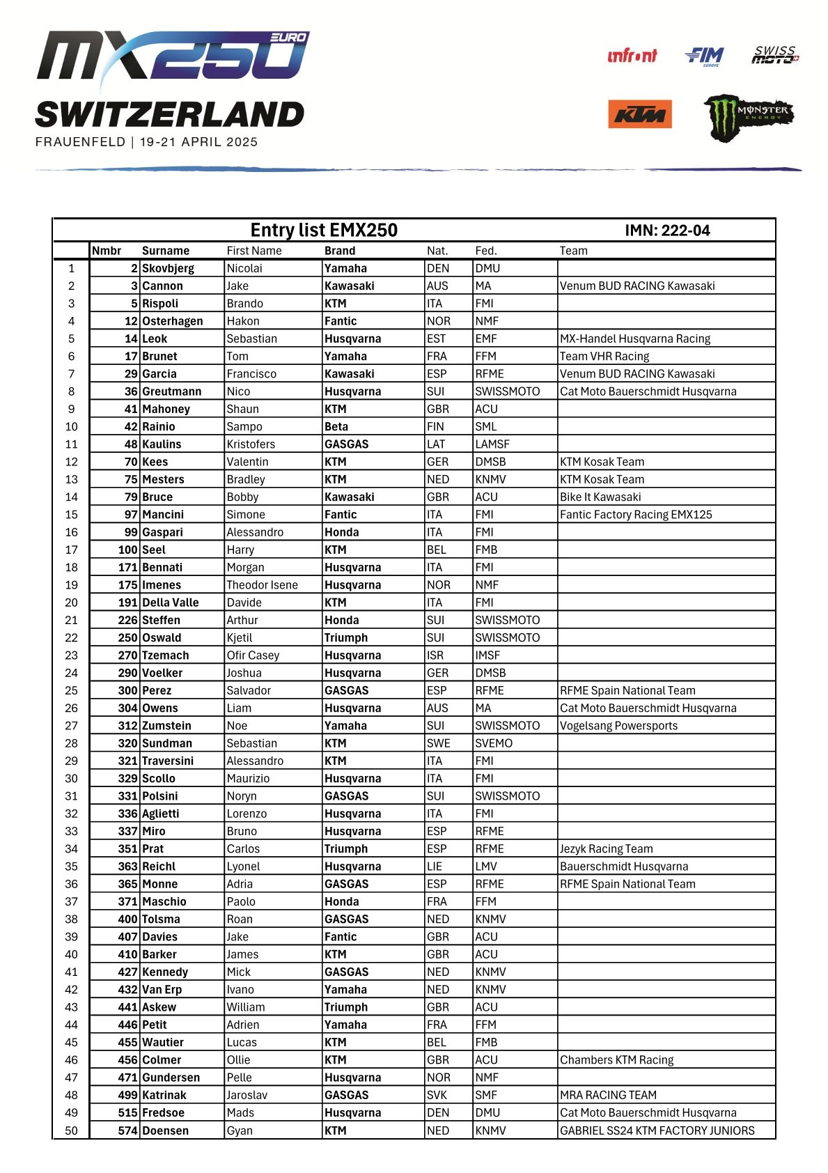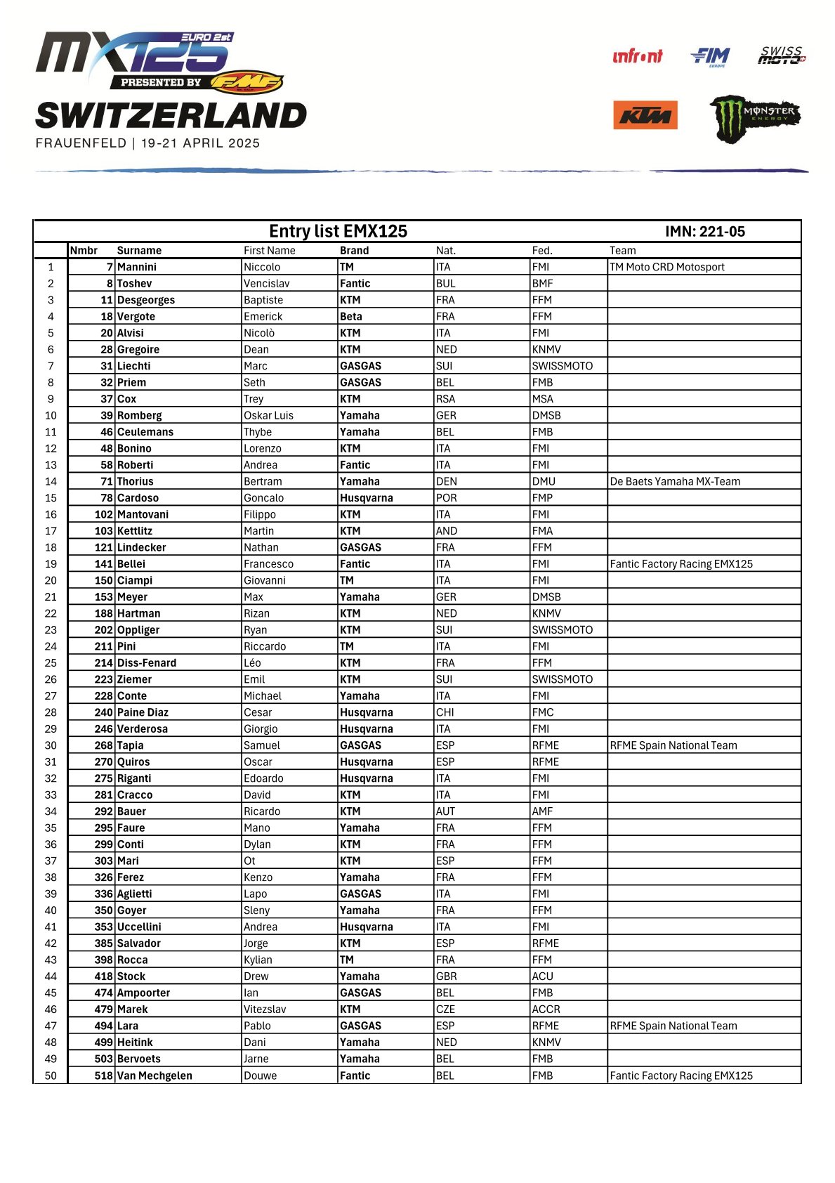 Wie staan er aan de start bij de MXGP in Zwitserland by motocrossplanet14 april 2025 Het wereldkampioenschap gaat in een sneltreinvaart verder met aankomend weekend alweer de zesde wedstrijd in het Zwitserse Frauenfeld. Wie er allemaal mee doen zie je op de deelnemerslijsten! TIMETABLE MXGP ENTRY LIST MX2 ENTRY LIST EMX 250 ENTRY LIST EMX 125 ENTRY LIST Photocredits – MXGP