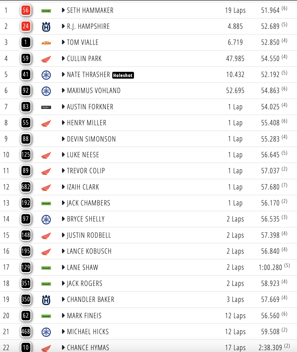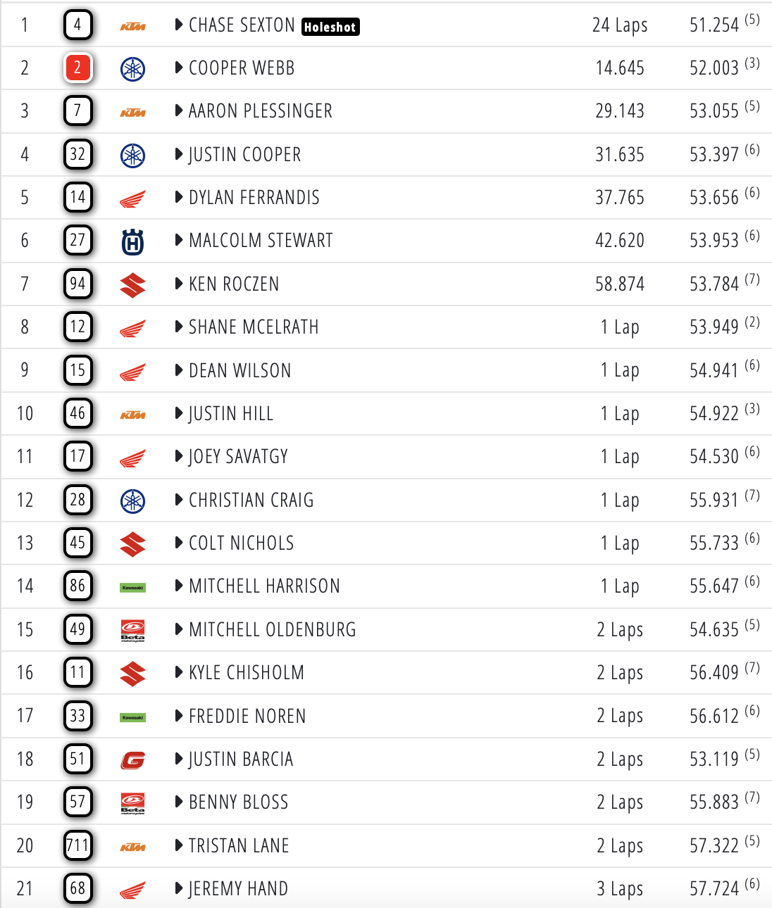 Sexton en Hammaker winnen Supercross in East Rutherford by motocrossplanet19 april 2025 Chase Sexton en Seth Hammaker hebben de AMA Supercross in East Rutherford weten te winnen. Bekijk de volledige uitslagen hieronder: 450: 250: