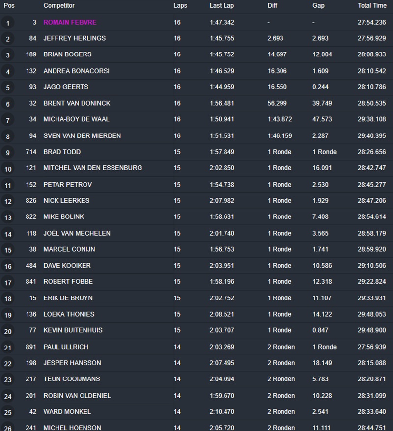 Romain Febvre heeft de eerste manche van de 500 klasse in Oldebroek weten te winnen. Jeffrey Herlings volgde hem van kort bij en werd tweede voor Brian Bogers, Andrea Bonacorsi en Jago Geerts.
