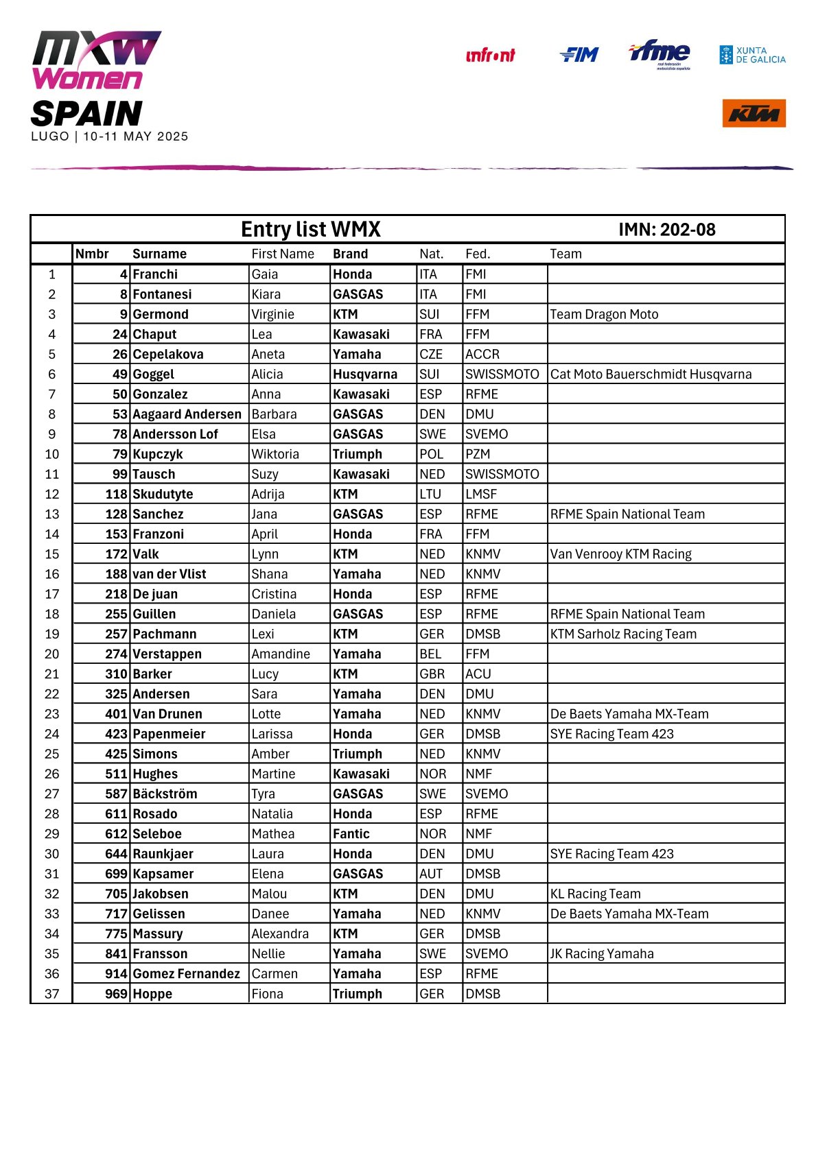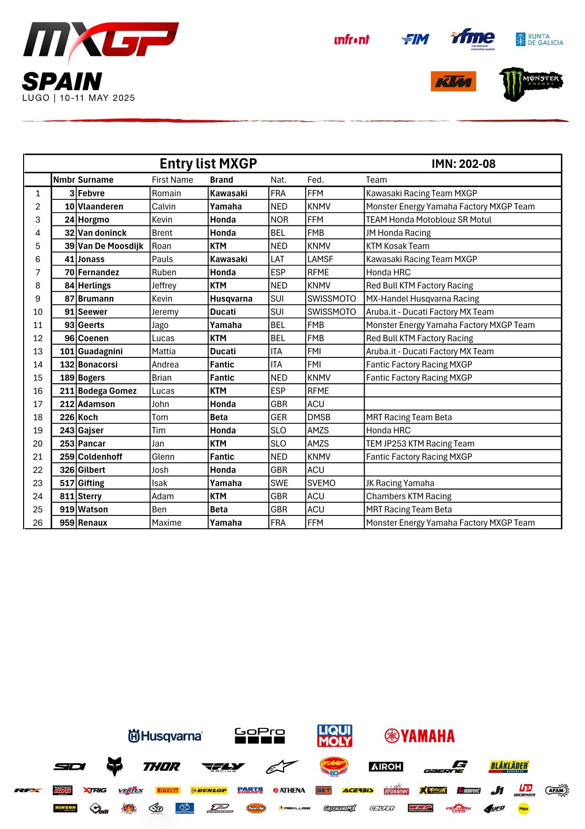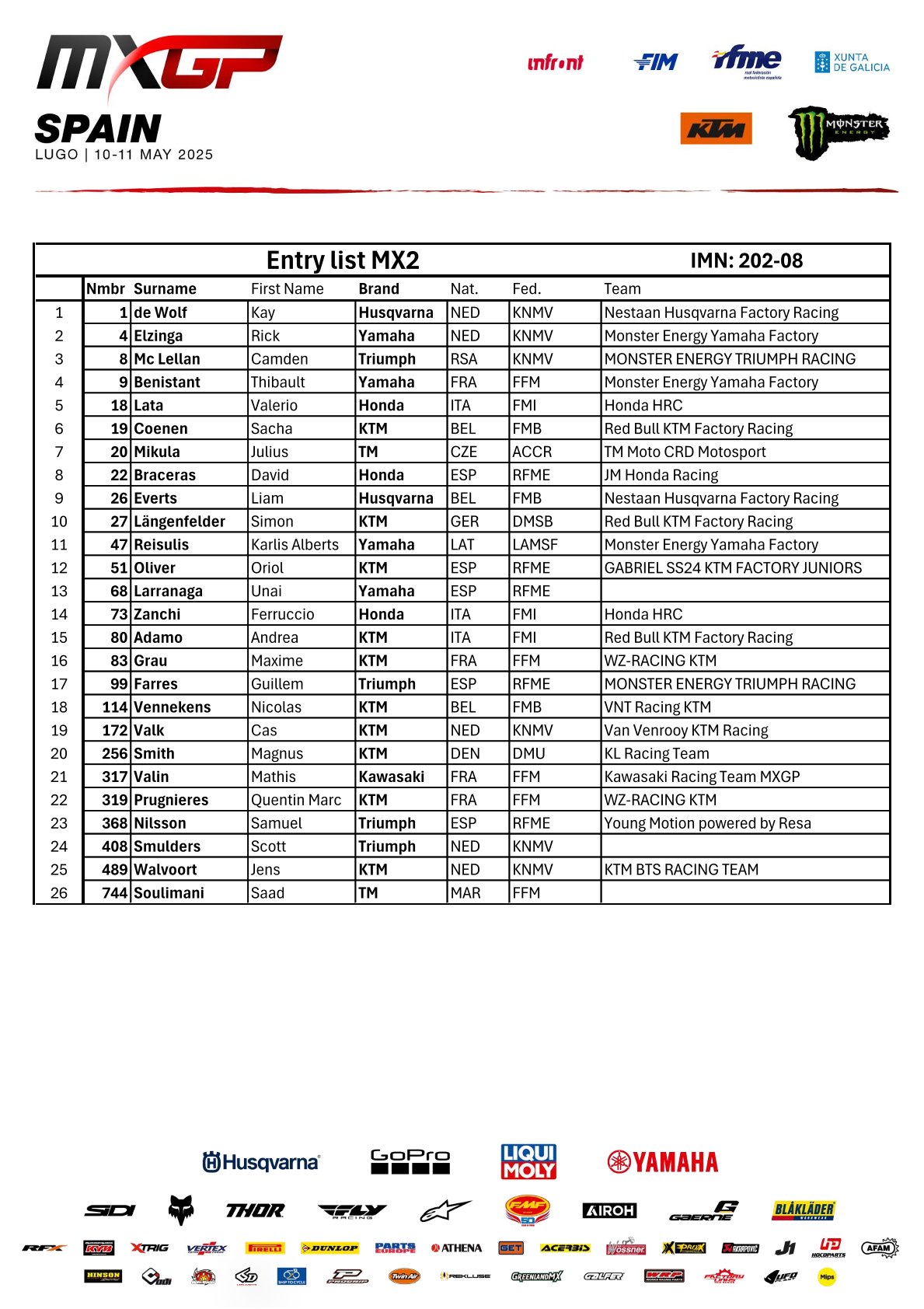 Aankomend weekend wordt de achtste wedstrijd van het wereldkampioenschap MXGP en MX2 verreden in Lugo, Galicia. Ook rijden hier de EMX250 en de WMX klasse een wedstrijd om de punten! Wie er allemaal aan de start komen, zie je hieronder: