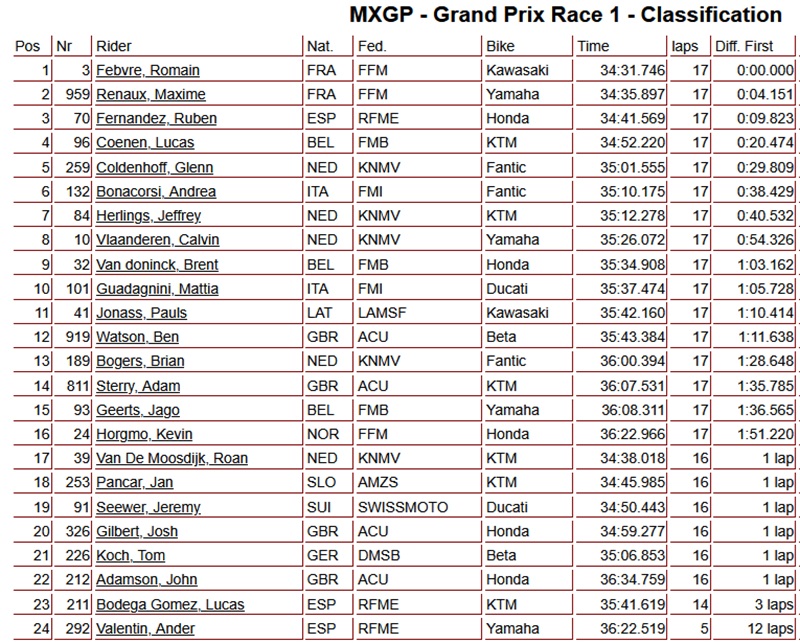 Romain Febvre heeft de eerste manche van de MXGP in Galicie gedomineerd. Febvre nam kopstart en bouwde gedurende de wedstrijd een veilige voorsprong op. Achter Febvre wist Maxime Renaux tweede te worden voor Ruben Fernandez en Lucas Coenen.