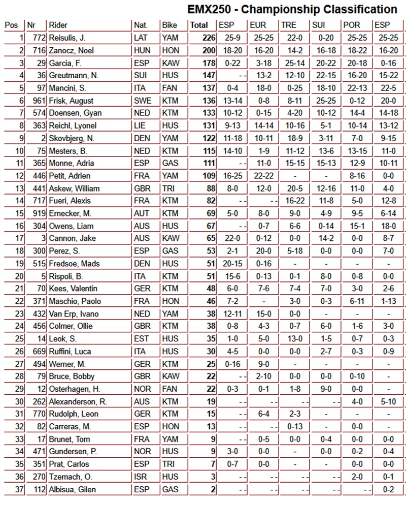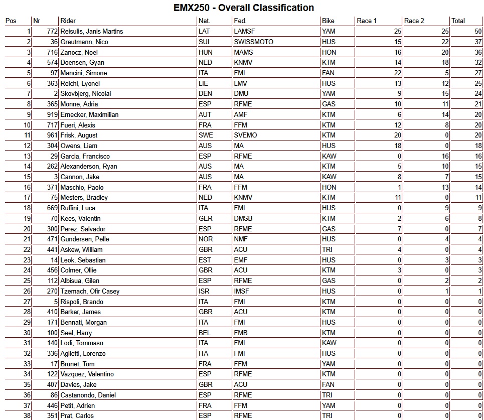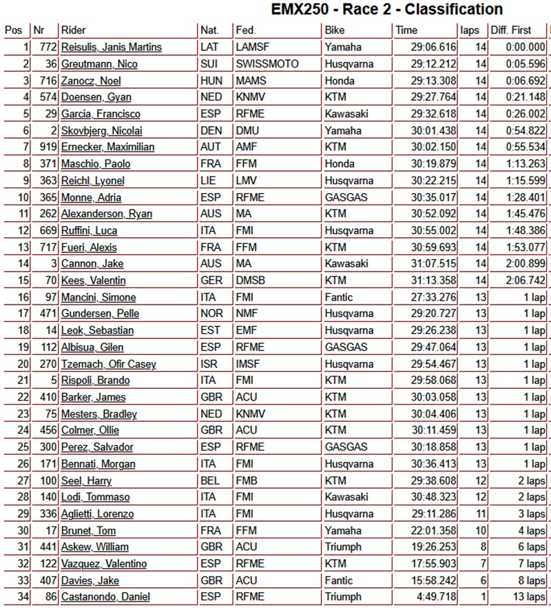 Op een zeer modderig circuit heeft Janis Martins Reisulis de tweede manche van de EMX250 klasse in Spanje weten te winnen. Reisulis domineerde de manche en won voor Nico Greutmann en Noel Zanocz. Gyan Doensen werd sterk vierde voor Francisco Garcia. Bradley Mesters kwam in deze manche helaas niet tot scoren.