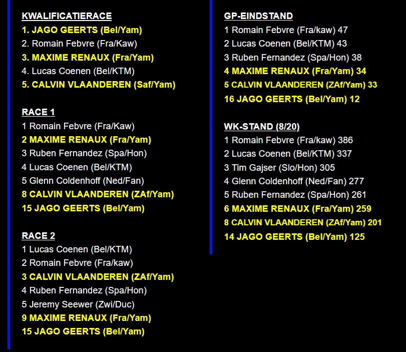 Renaux: “Vierde in de eindstand. Best een goede Grote Prijs dus, met veel WK-punten. De eerste reeks was echt heel goed. Spijtig van die vroege val in de tweede reeks. Ik heb daar veel tijd verloren. Het was heel moeilijk om op dit parcours plaatsen goed te maken. Net geen podium dus. Dat is wel jammer. Maar nogmaals: gezien de situatie, gezien het blessureleed is dit een heel degelijk resultaat. Nu heb ik twee weken om wat te herstellen. Hopelijk volstaat dat om fit te geraken voor de GP in Ernée.”