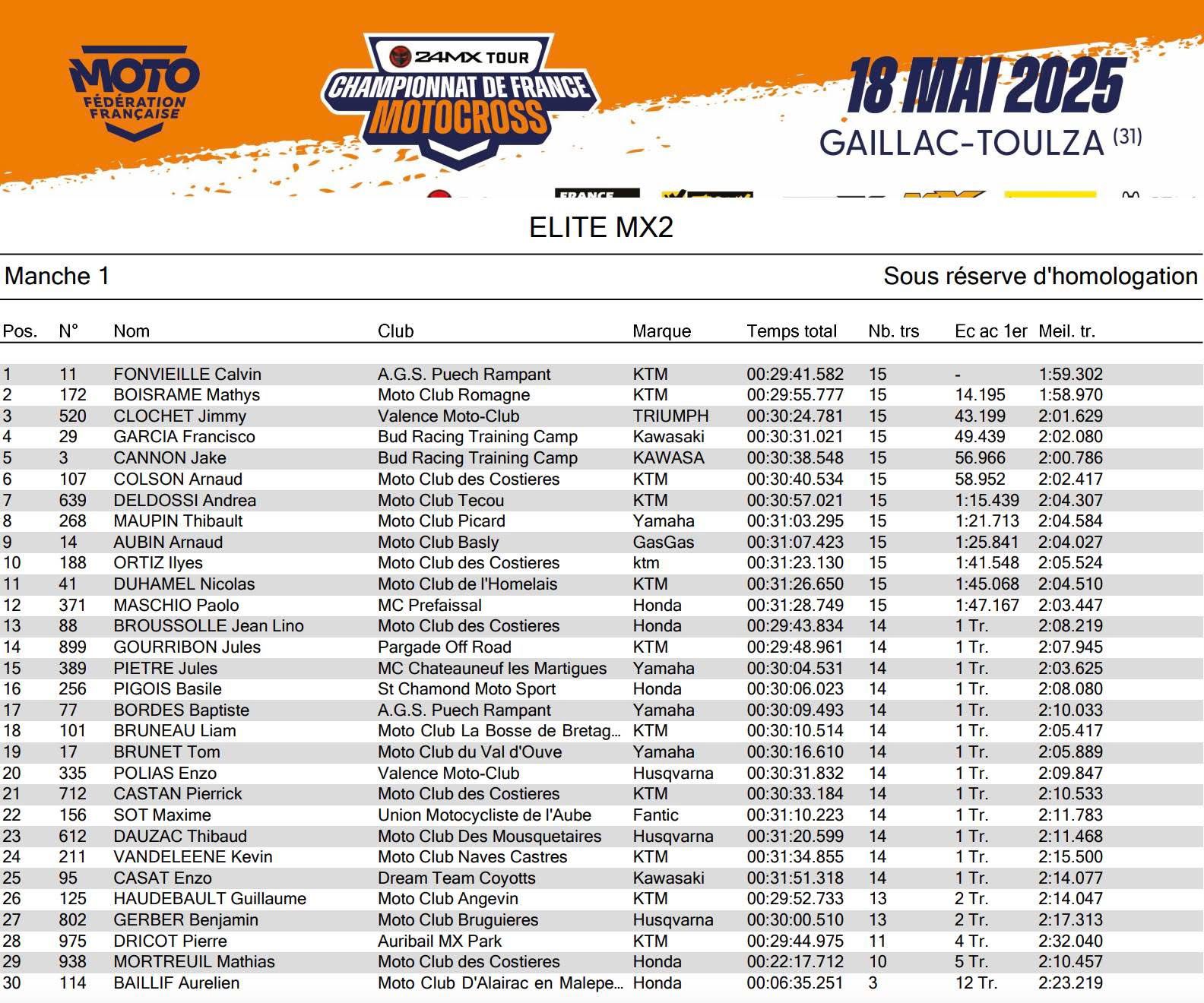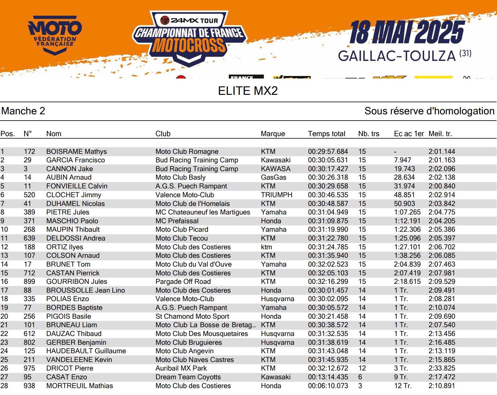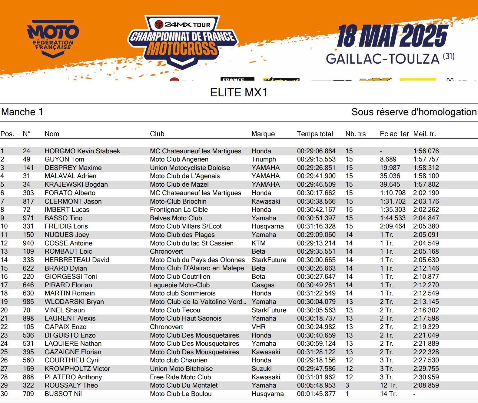 Horgmo en Boisrame winnen Frans Kampioenschap in Gaillac Toulza by motocrossplanet18 mei 202518 mei 2025 Kevin Horgmo en Mathys Boisrame hebben het Frans Kampioenschap in Gaillac Toulza weten te winnen. Bekijk de uitslagen hieronder: