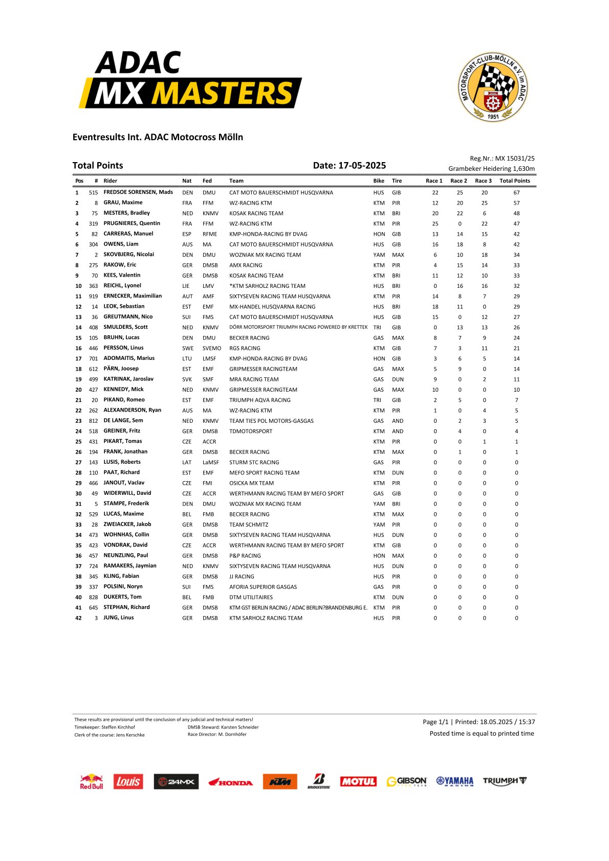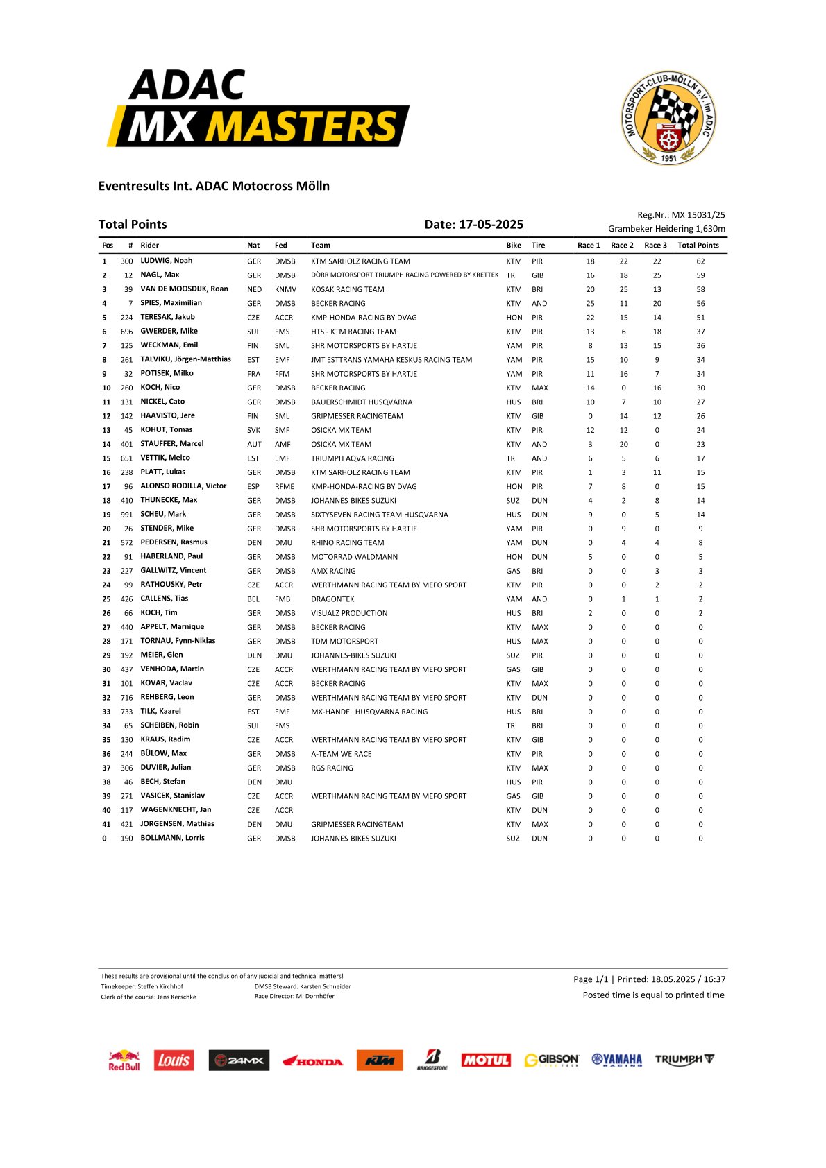 Ludwig, Fredsoe en Laicans winnen ADAC in Molln by motocrossplanet18 mei 2025 Noah Ludwig, Mads Fredsoe en Raivo Laicans hebben de tweede wedstrijd van de ADAC Masters competitie in Molln weten te winnen. Bekijk de daguitslagen hieronder. MX Masters: MX Youngster Cup: MX Junior Cup 125: Fotocredit ADAC: