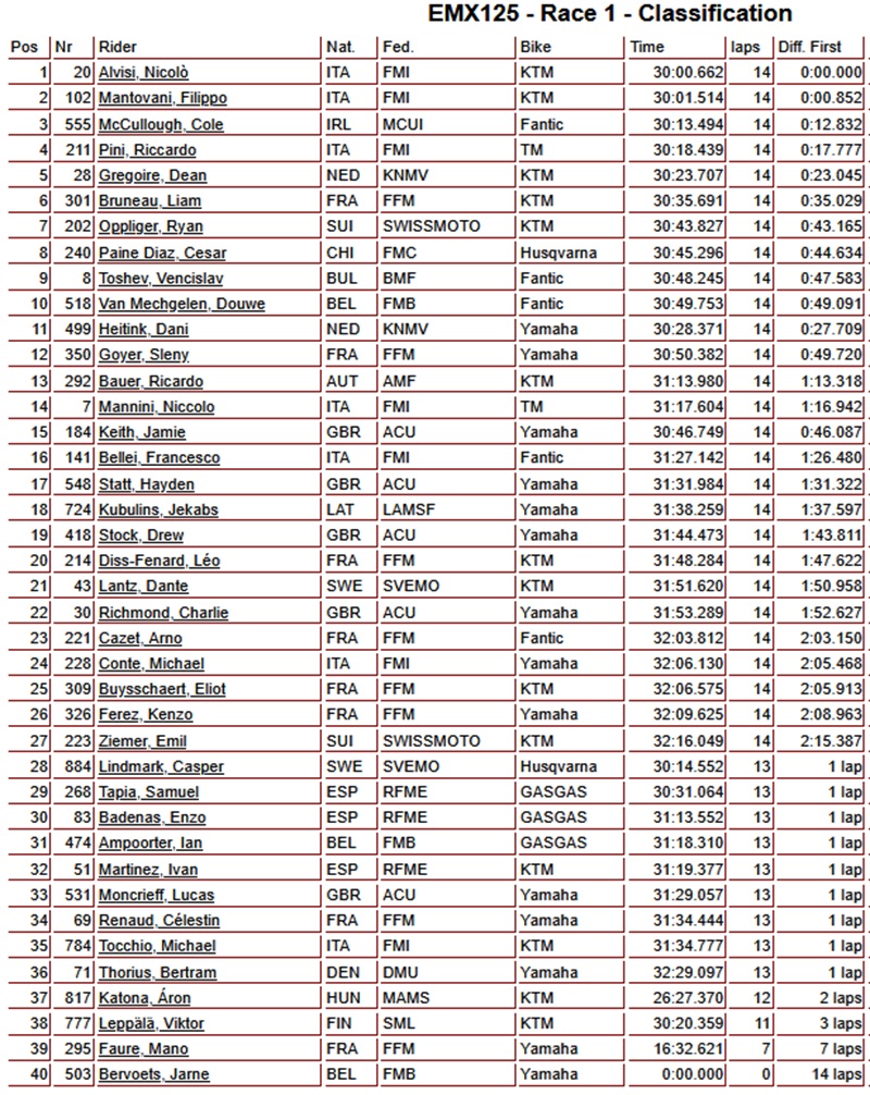 De eerste manche van de EMX125 klasse in het Franse Ernee is gewonnen door Nicolo Alvisi voor Filippo Mantovani en Cole McCullough. Riccardo Pini werd vierde voor Dean Gregoire. Dani Heitink kwam als zesde over de finish maar omdat zijn motor na de finish teveel geluid maakte, kreeg hij vijf strafplaatsen en werd als elfde geklasseerd.
