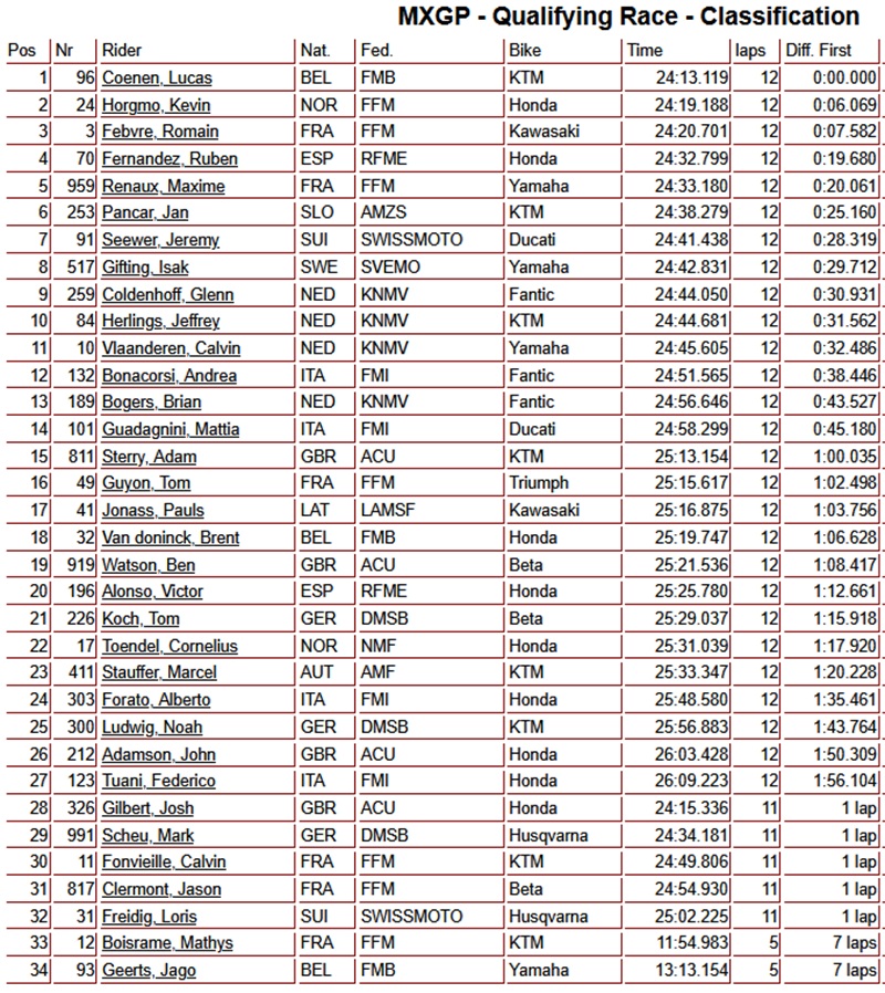 Lucas Coenen wint kwalificatie MXGP in Frankrijk by motocrossplanet24 mei 2025 Lucas Coenen heeft de kwalificatieheat van de MXGP klasse in Frankrijk gedomineerd. Kevin Horgmo finishte als tweede voor Romain Febvre. Bekijk hieronder de uitslagen: Photocredits – Juan Pablo Acevedo