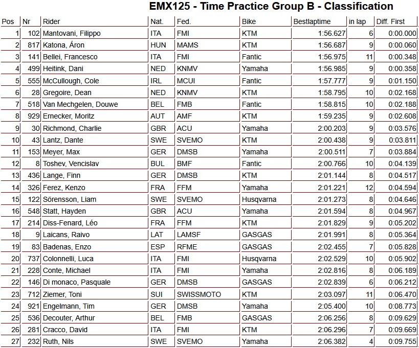 Alvisi snelste in tijdtraining EMX125 Duitsland by motocrossplanet31 mei 2025 Nicolò Alvisi heeft in de tijdtraining van de EMX125 klasse in Duitsland de snelste tijd neer weten te zetten. Bekijk de uitslagen hieronder: Photocredits – Juan Pablo Acevedo