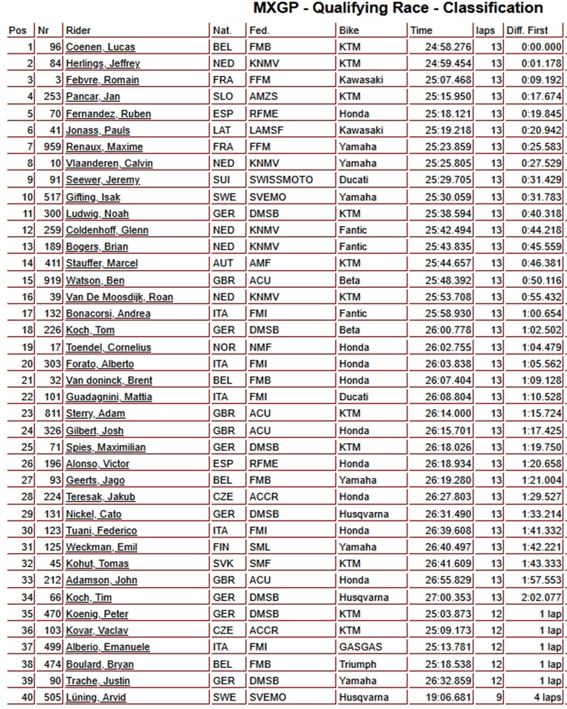 Coenen wint kwalificatie MXGP voor Herlings in Duitsland by motocrossplanet31 mei 202531 mei 2025 Lucas Coenen heeft de kwalificatieheat van de MXGP klasse weten te winnen voor de sterk rijdende Jeffrey Herlings en Romain Febvre. Bekijk de volledige uitslag hieronder: Photocredits – Juan Pablo Acevedo