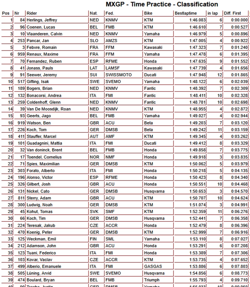 Herlings snelste in tijdtraining MXGP Duitsland by motocrossplanet31 mei 202531 mei 2025 Jeffrey Herlings heeft in de tijdtraining van de MXGP klasse in Duitsland de snelste tijd neer weten te zetten. Bekijk hieronder de uitslagen: Photocredits – Juan Pablo Acevedo Dit bericht op Instagram bekijken Een bericht gedeeld door MXVICE.COM (@mxvice)