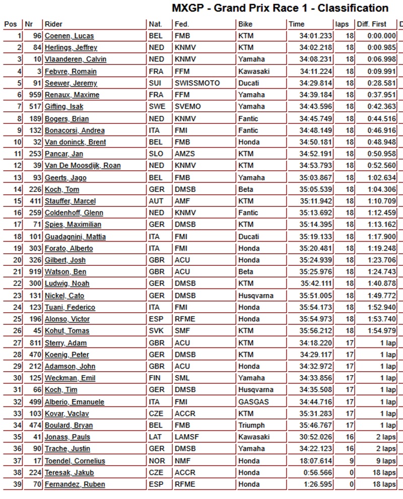 Lucas Coenen heeft de eerste manche van de Grand Prix van Duitsland gewonnen voor Jeffrey Herlings. Beide rijders reden de hele wedstrijd wiel aan wiel. Coenen hield het hoofd koel tot aan de finish en won voor Herlings en Calvin Vlaanderen. Romain Febvre zat hier de hele manche net achter maar kon geen inhaalmanoeuvre forceren en moest genoegen nemen met een vierde plaats.