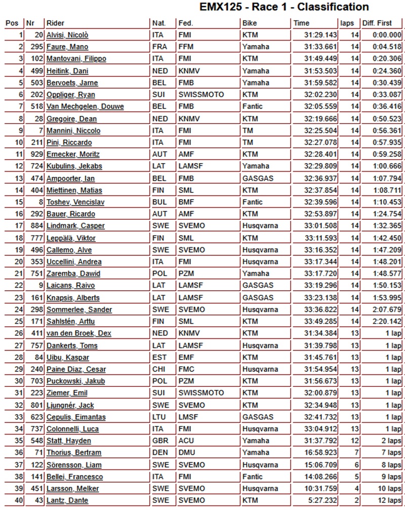 Alvisi wint eerste manche EMX125 Letland by motocrossplanet7 juni 20257 juni 2025 Nicolo Alvisi heeft de eerste manche van de EMX125 klasse in Letland weten te winnen. Bekijk de volledige uitslagen hieronder: Photocredits – Juan Pablo Acevedo