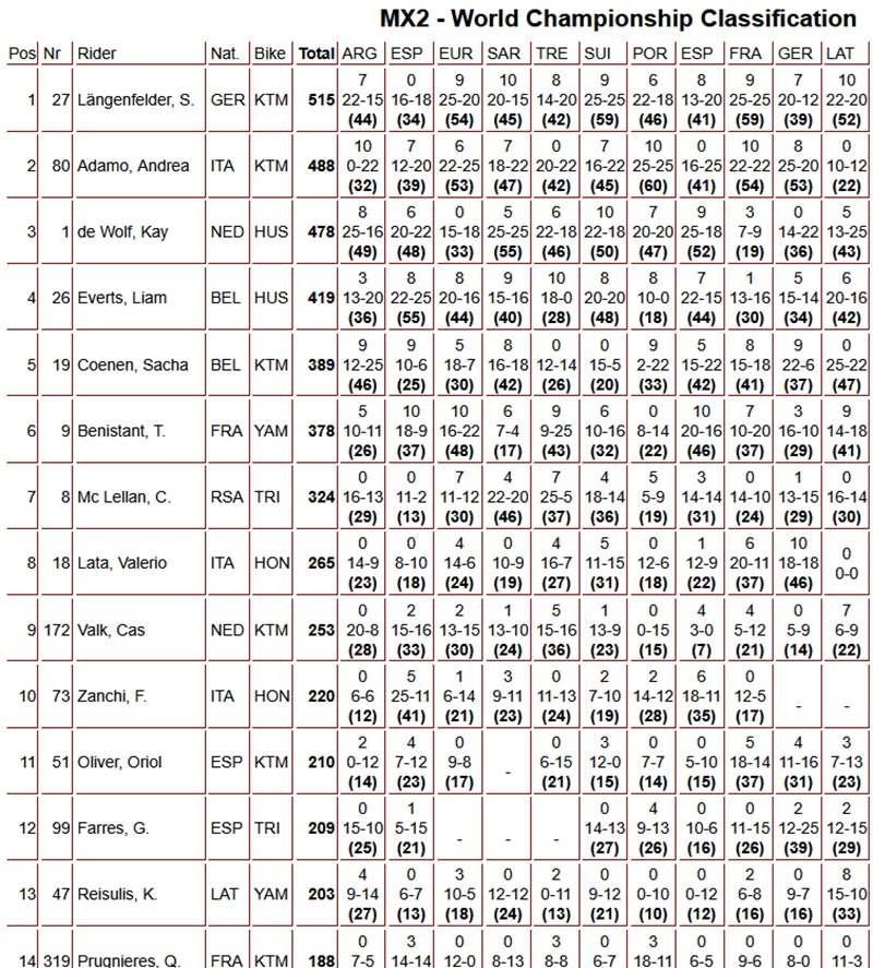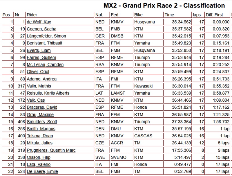 Kay de Wolf heeft de tweede manche van de Grand Prix in Letland weten te winnen voor Lucas Coenen en Simon Laengenfelder. Laengenfelder reed de hele manche aan de leiding maar kwam in de laatste ronde ten val en verloor de zege aan de Wolf en Coenen.