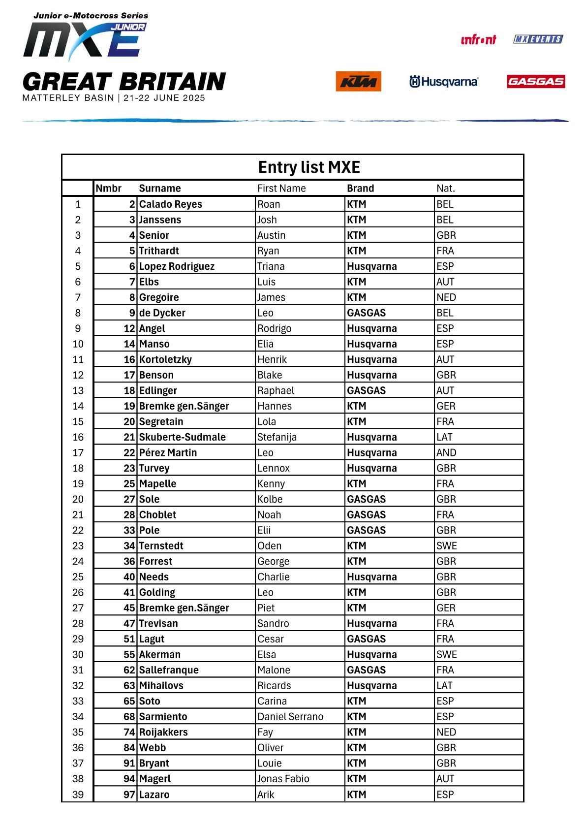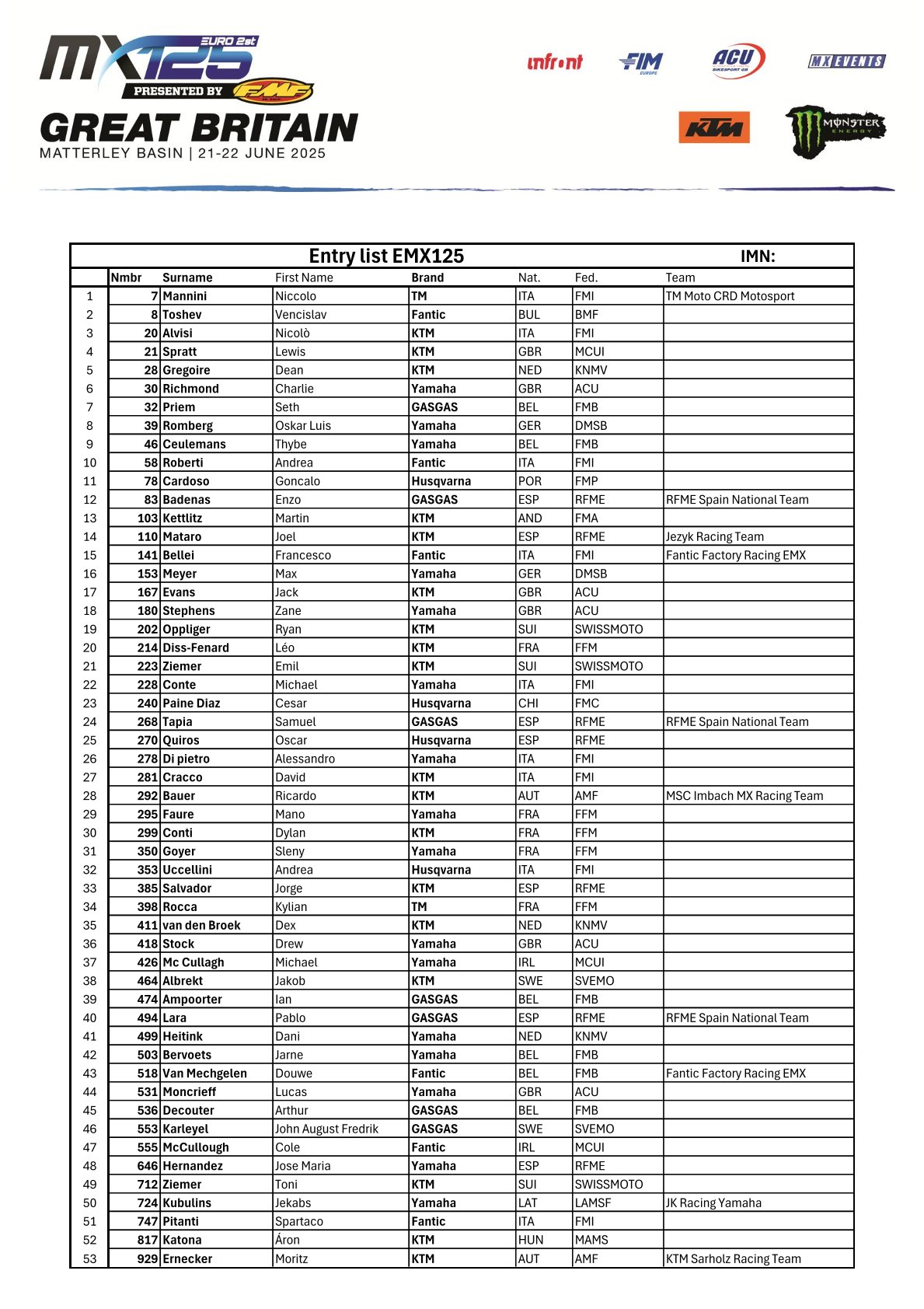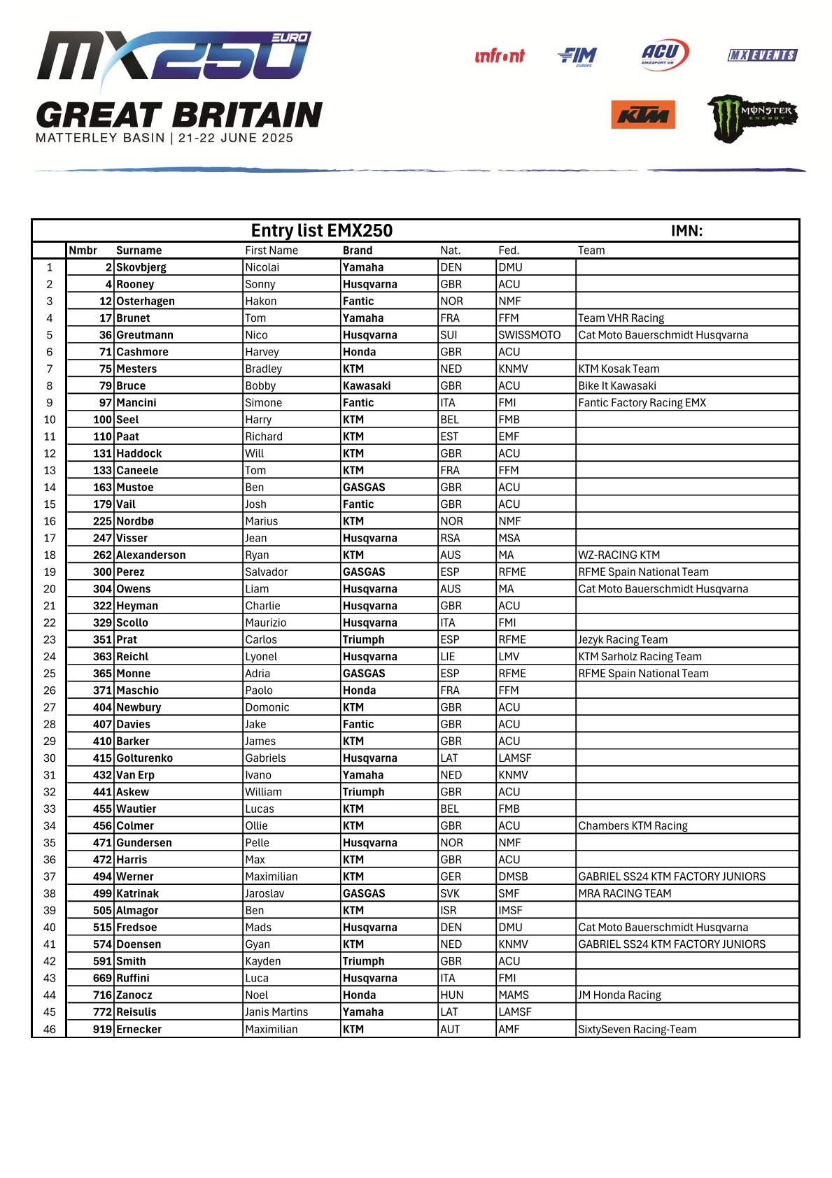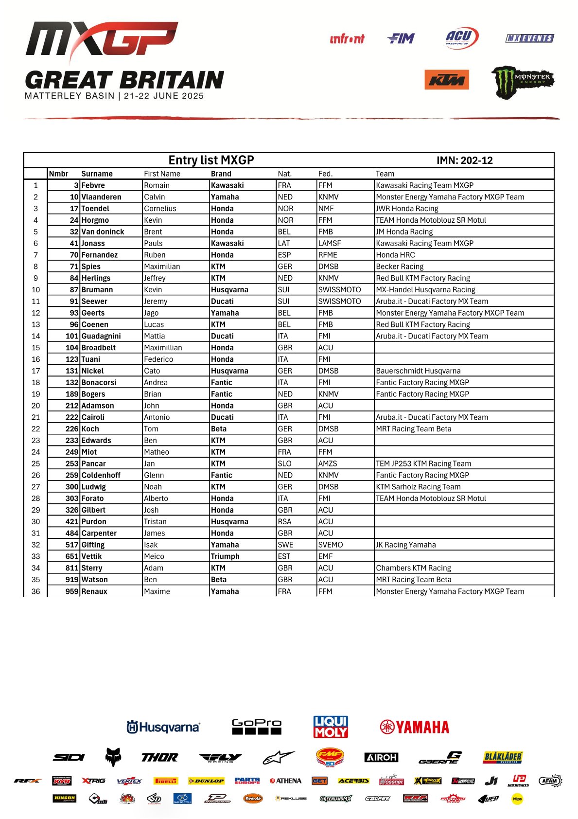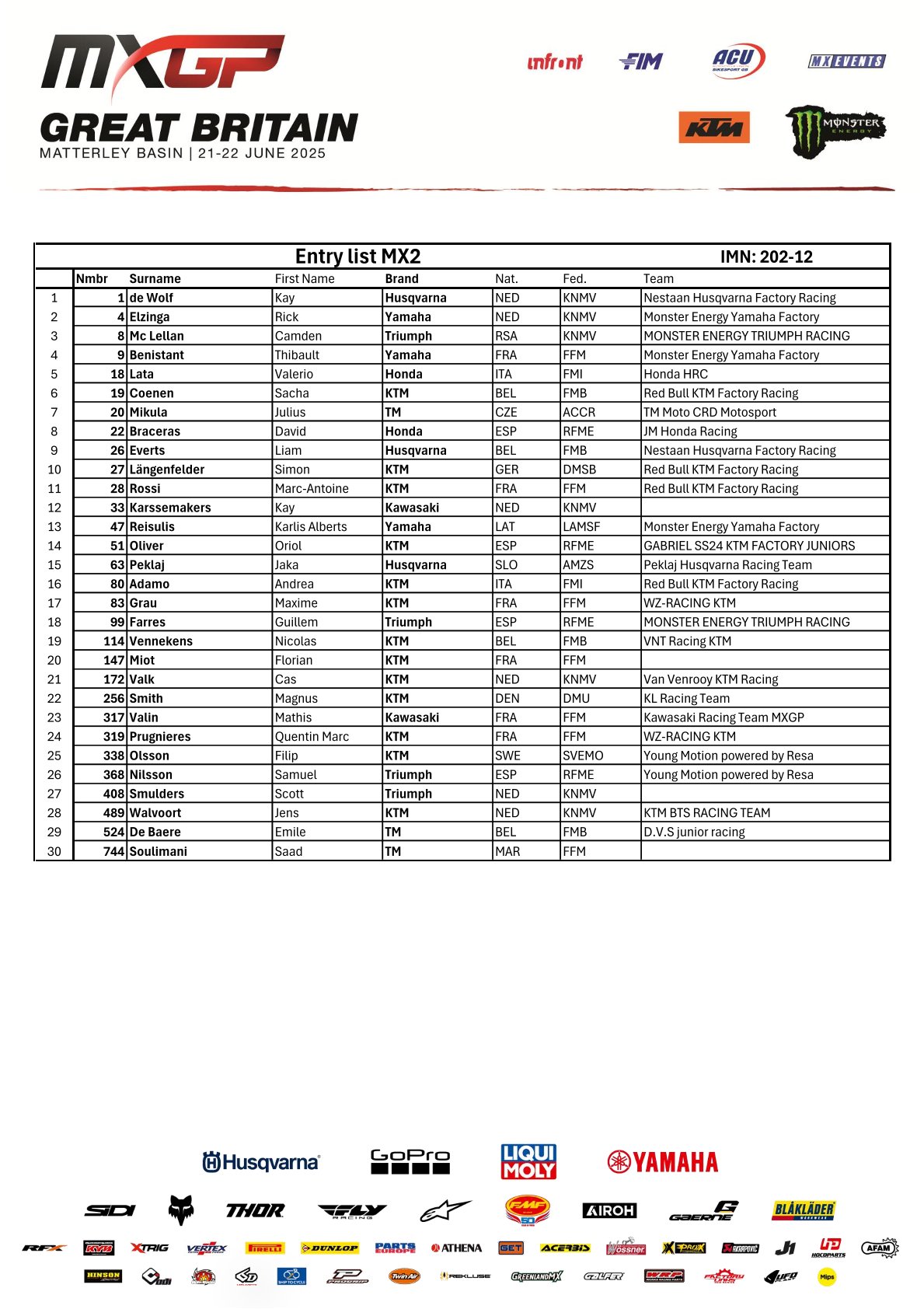 Deelnemerslijsten MXGP Engeland by motocrossplanet13 juni 202513 juni 2025 Volgend weekend wordt de twaalfde wedstrijd van het wereldkampioenschap MXGP verreden in het Britse Matterley Basin. Bekijk hieronder welke rijders er aan de start komen! TIMETABLE MXGP ENTRY LIST MX2 ENTRY LIST EMX250 ENTRY LIST EMX125 PRESENTED BY FMF RACING ENTRY LIST MXE ENTRY LIST Photocredits – MXGP