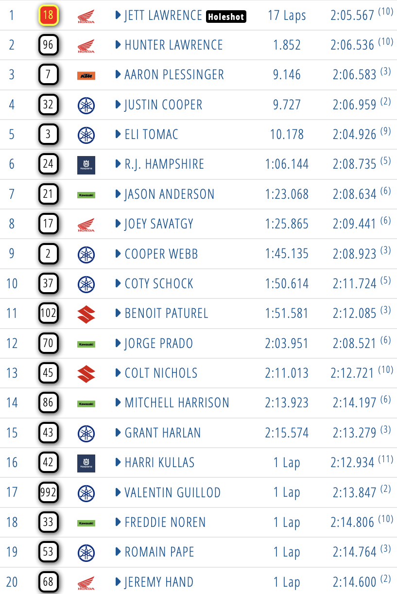 Lawrence stelde snel orde op zaken en nam binnen een aantal ronden de leiding terug in handen. In de rest van de manche wist hij een voorsprong op te bouwen en won voor Hunter Lawrence en Aaron Plessinger. Justin Cooper en Eli Tomac wisten vierde en vijfde te worden.