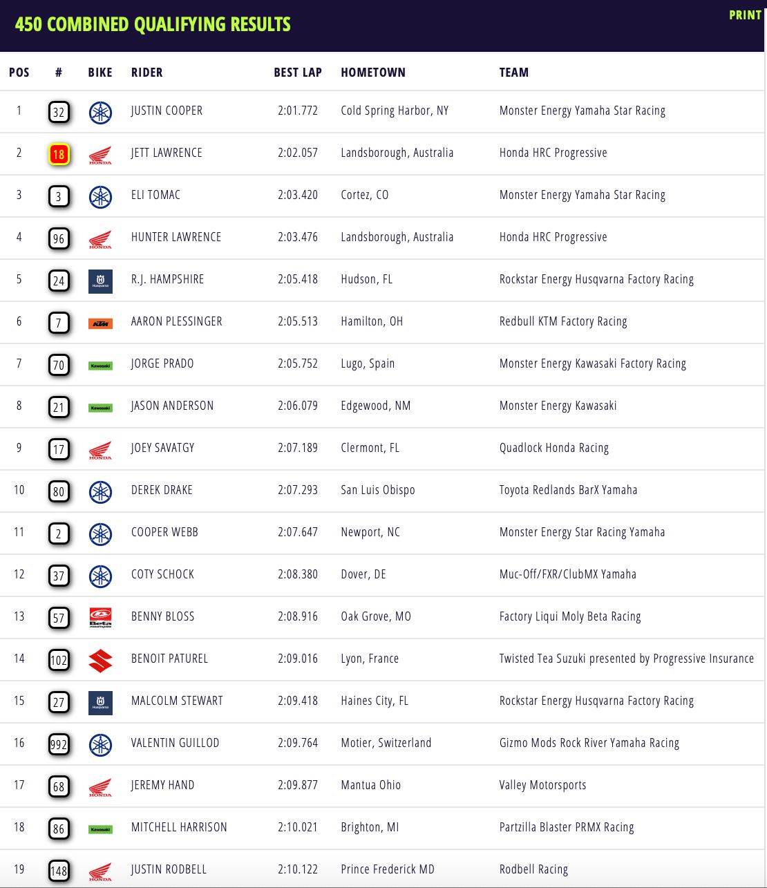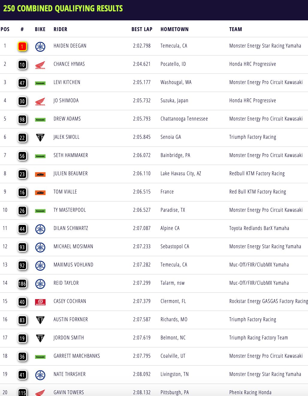 Justin Cooper en Haiden Deegan pakken pole position in High Point by motocrossplanet14 juni 202514 juni 2025 Justin Cooper en Haiden Deegan hebben de in de kwalificaties van de vierde wedstrijd van het AMA Pro Motocross Kampioenschap in High Point de snelste tijd op de klok weten te zetten. Bekijk de tijden hieronder: Photocredits – Align Media