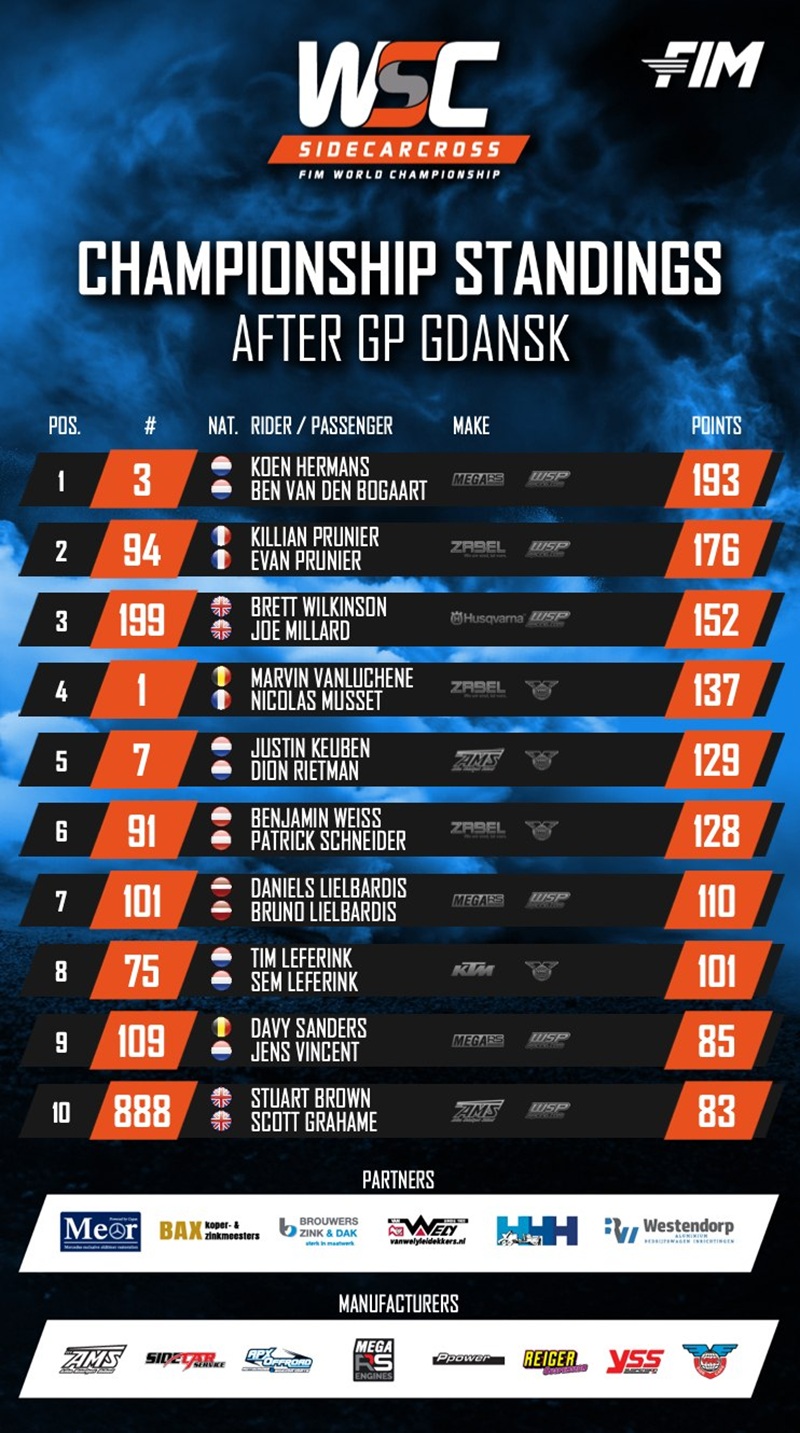 De zijspancombinatie Prunier heeft beide manches van het WK Zijspancross in Polen weten te winnen voor gebroeders Lielbardis en Keuben/Rietman. Hermans/van den Bogaart werden vierde voor Wilkinson/Millard.